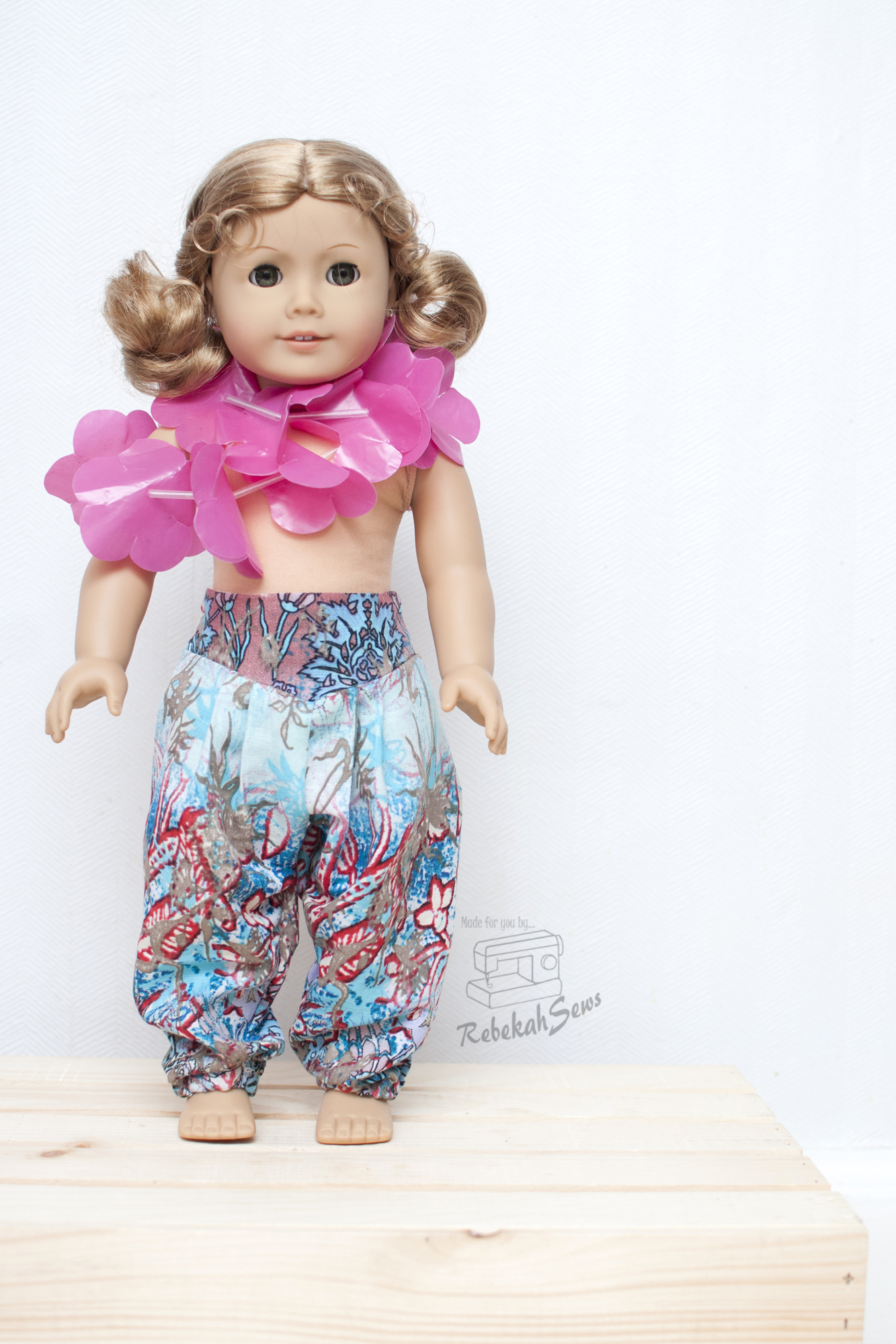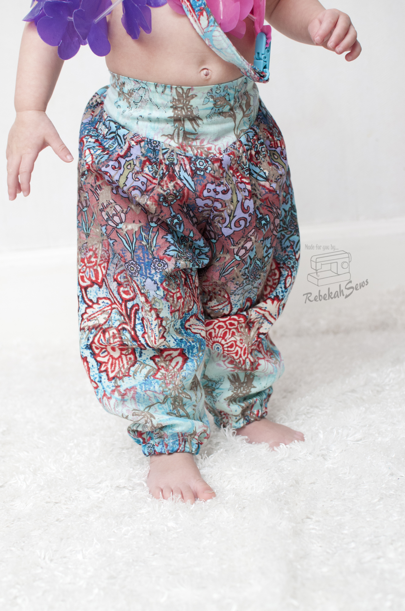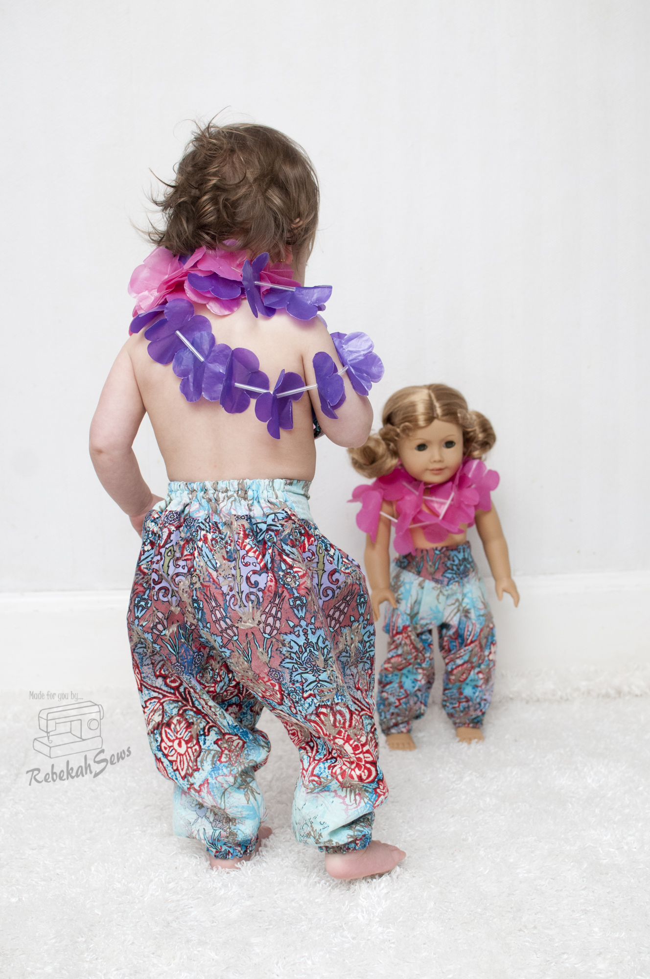 RTC_0272I used a very cool woven fabric I have been hoarding for awhile waiting for the perfect pattern. Well this was it! I just knew it as soon as I saw the pattern. I couldn’t be happier with the results. For baby girl I made the 12-18mo with the pointed waistband and elastic hem. The fit is great with room to grow. She looks absolutely adorable (yes, I’m a little biased) and comfy in these. I also made matching doll pants too! Don’t they make such a cute pair?