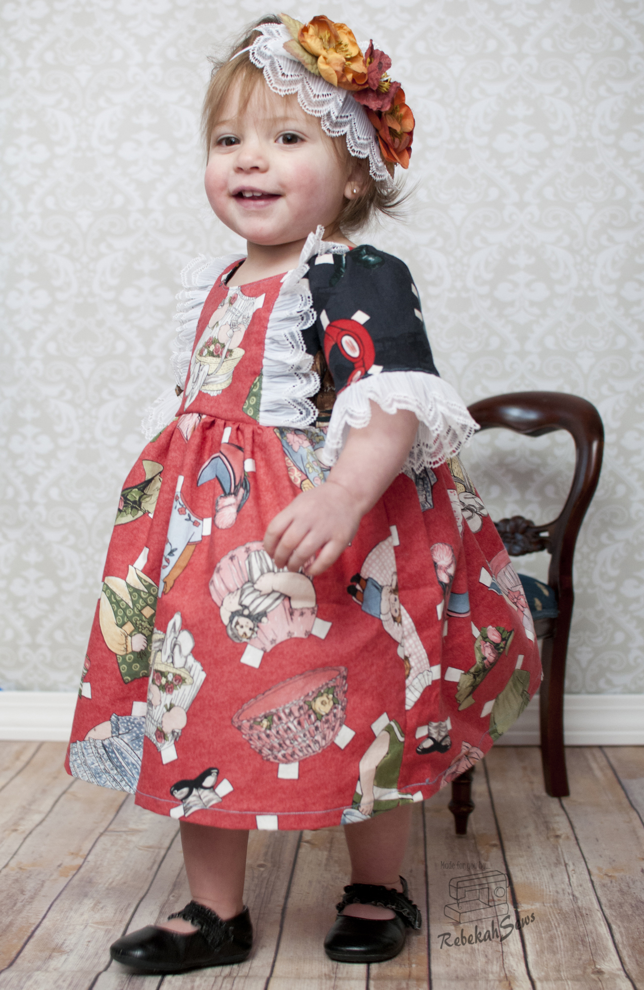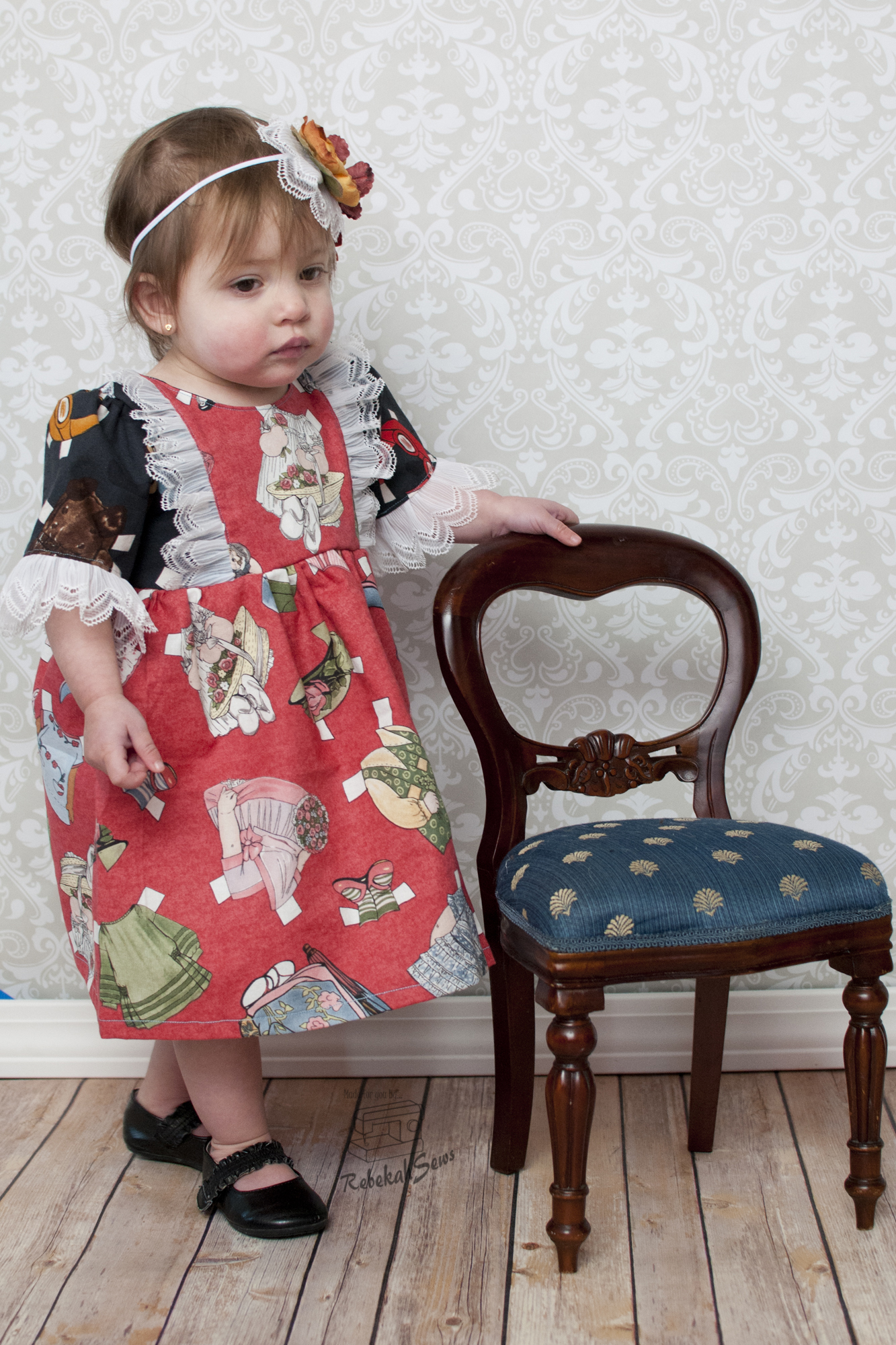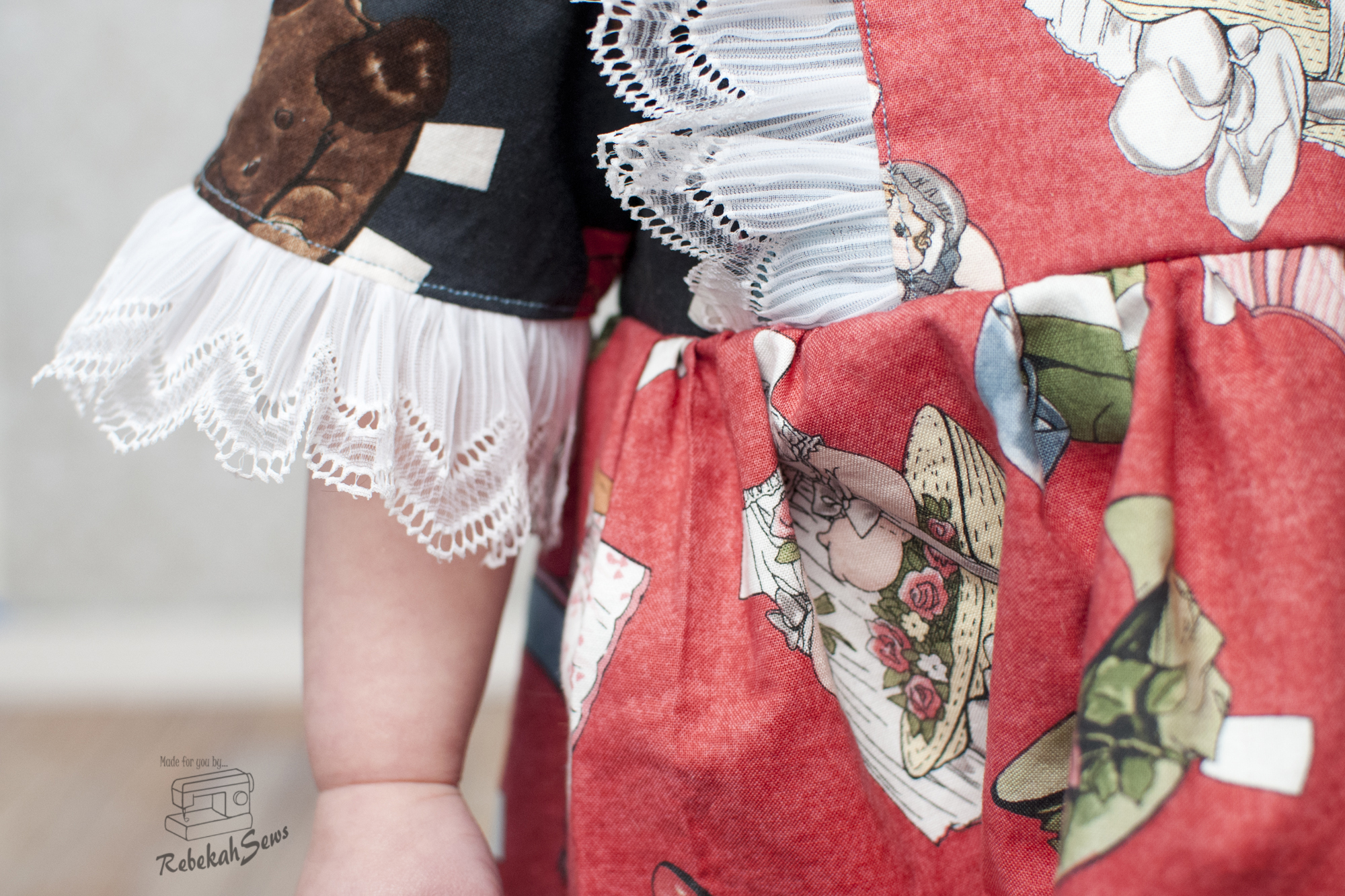 Now on to my dress. With my vintage looking paper doll fabric I knew I needed a little something more than just woven ruffles. Lace. If you know me, you know I love lace. RTC_0759The lace on the bodice ruffles and sleeves just gave it that look I was going for. Classic. Elegant. I am completely in love with this dress. As you can see, this one is a bit big on my girl. I went back and forth on the size to make. Her chest put her in the 6m size but she wears 12mo in RTW. Thinking I know best and not the measurements I made a straight 12mo size. Yup, it’s big. Note to self…always go by the measurements!! Some days I think I know it all, even when I know better than that. Well, on the plus side, we can enjoy this beauty for that much longer!