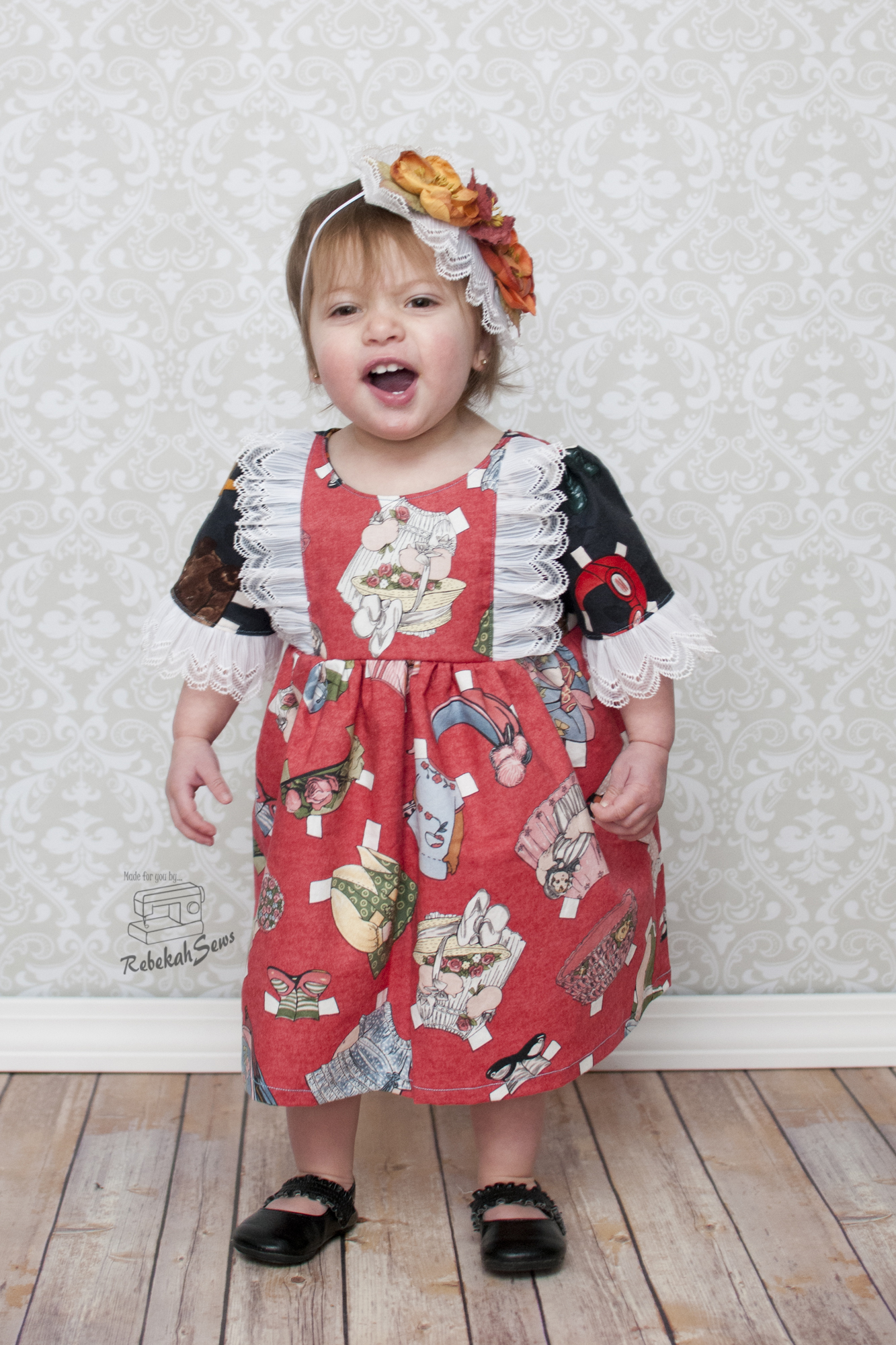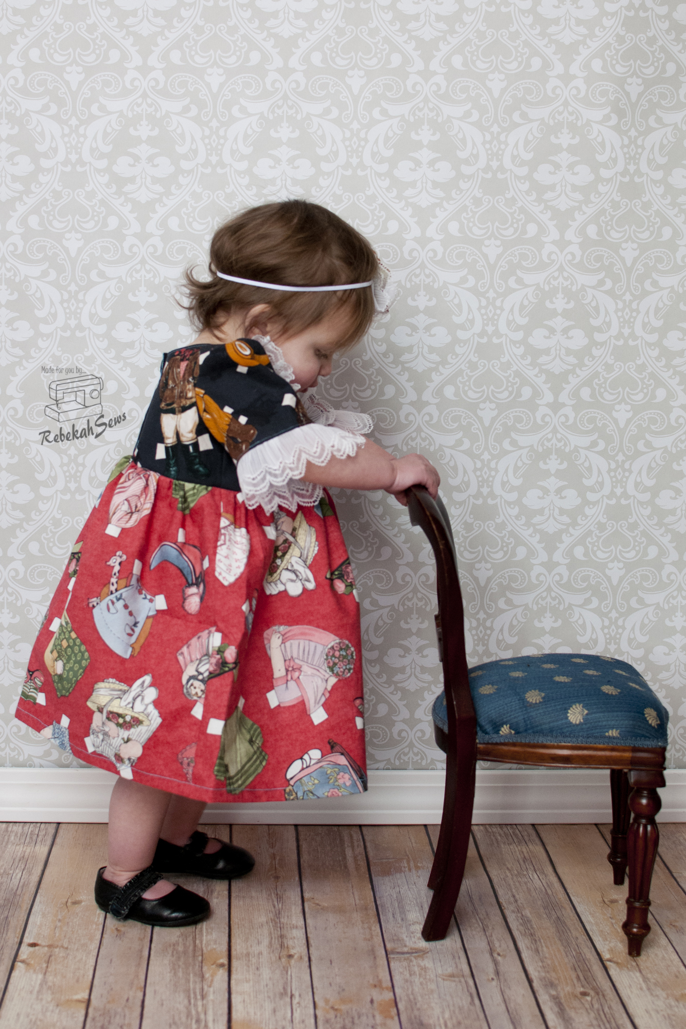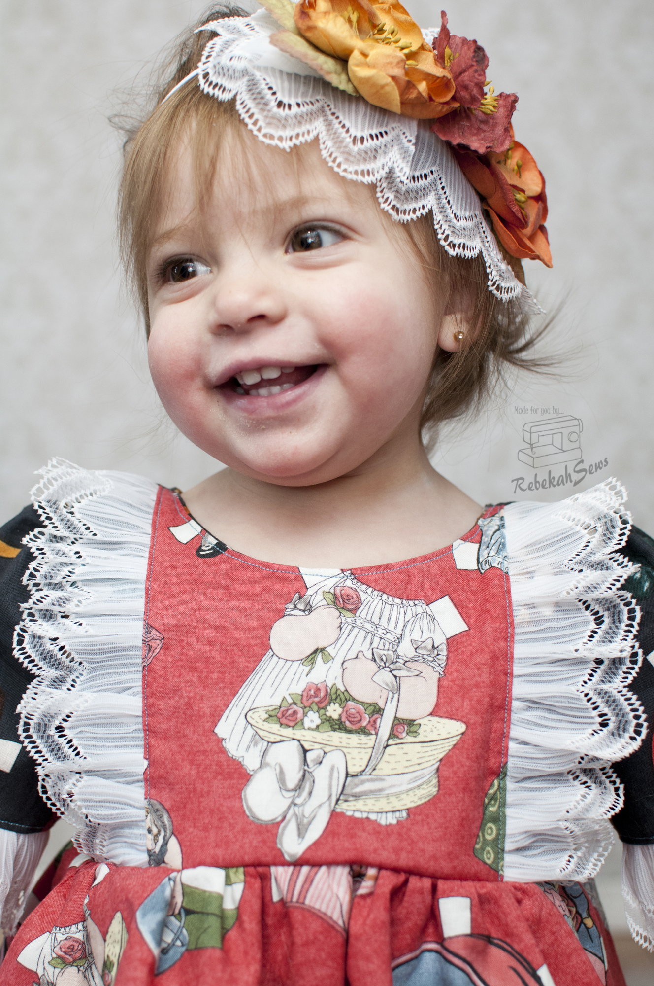 Now on to my dress. With my vintage looking paper doll fabric I knew I needed a little something more than just woven ruffles. Lace. If you know me, you know I love lace. RTC_0759The lace on the bodice ruffles and sleeves just gave it that look I was going for. Classic. Elegant. I am completely in love with this dress. As you can see, this one is a bit big on my girl. I went back and forth on the size to make. Her chest put her in the 6m size but she wears 12mo in RTW. Thinking I know best and not the measurements I made a straight 12mo size. Yup, it’s big. Note to self…always go by the measurements!! Some days I think I know it all, even when I know better than that. Well, on the plus side, we can enjoy this beauty for that much longer!
