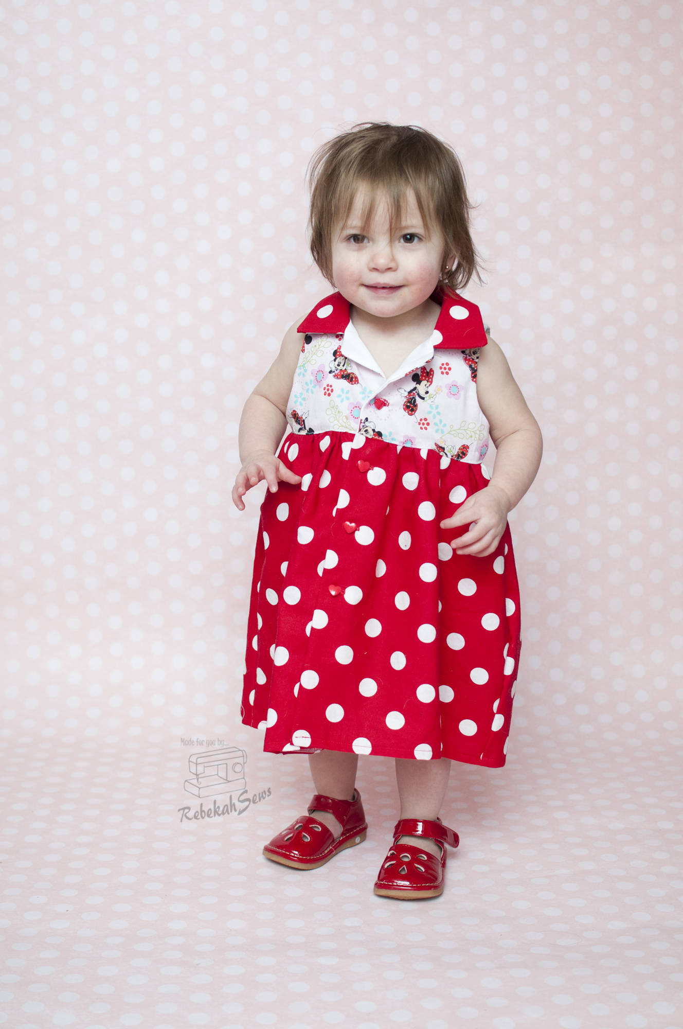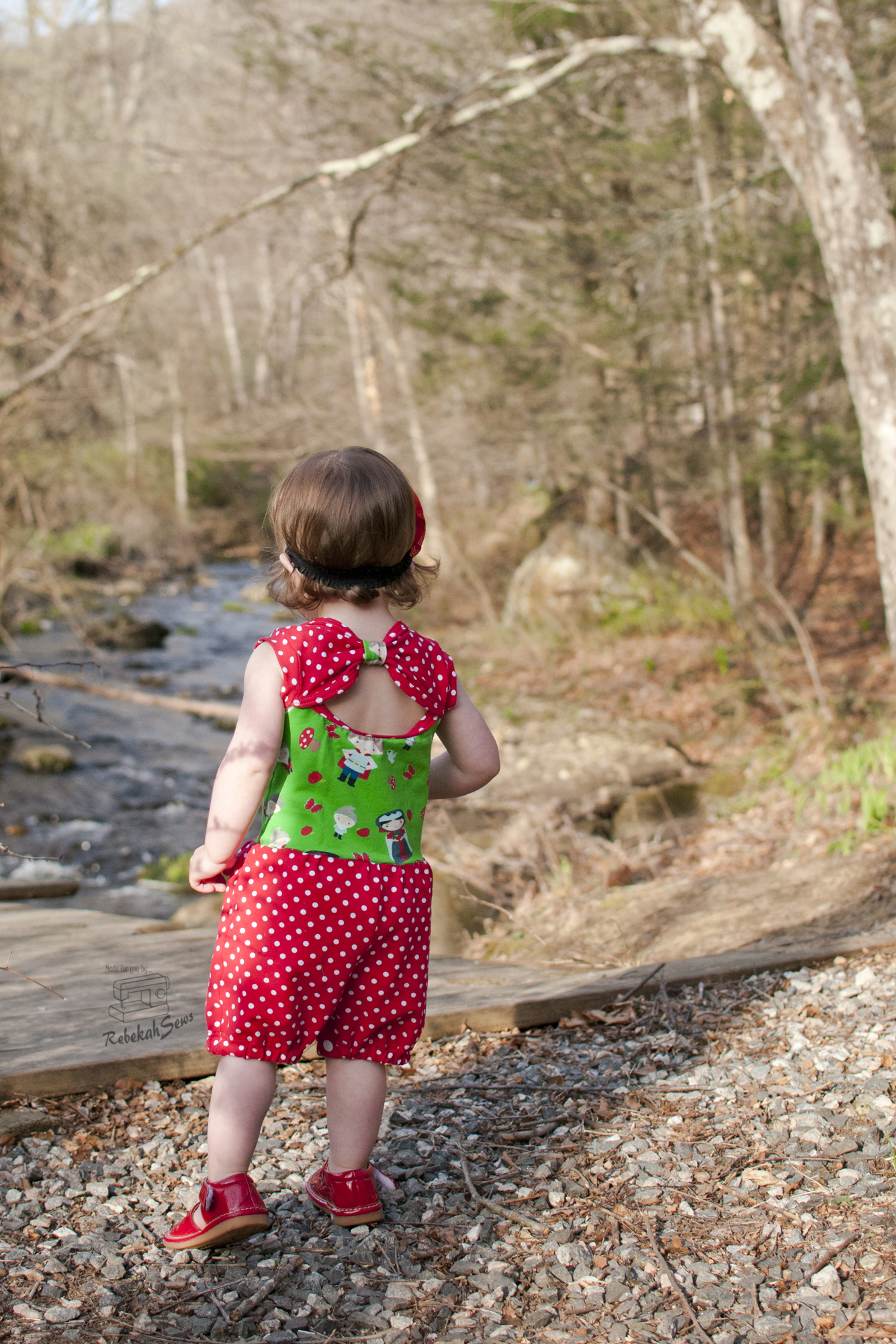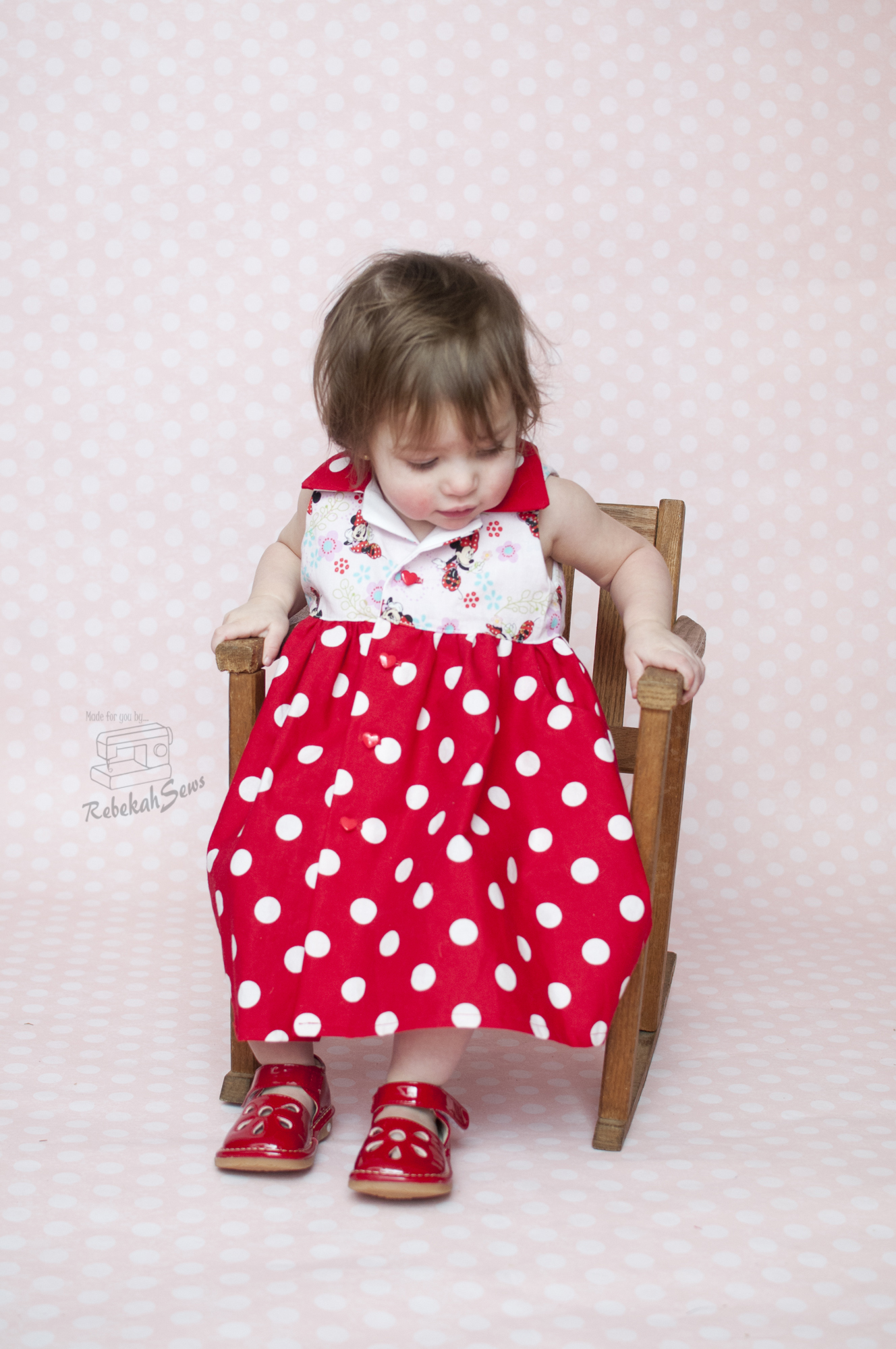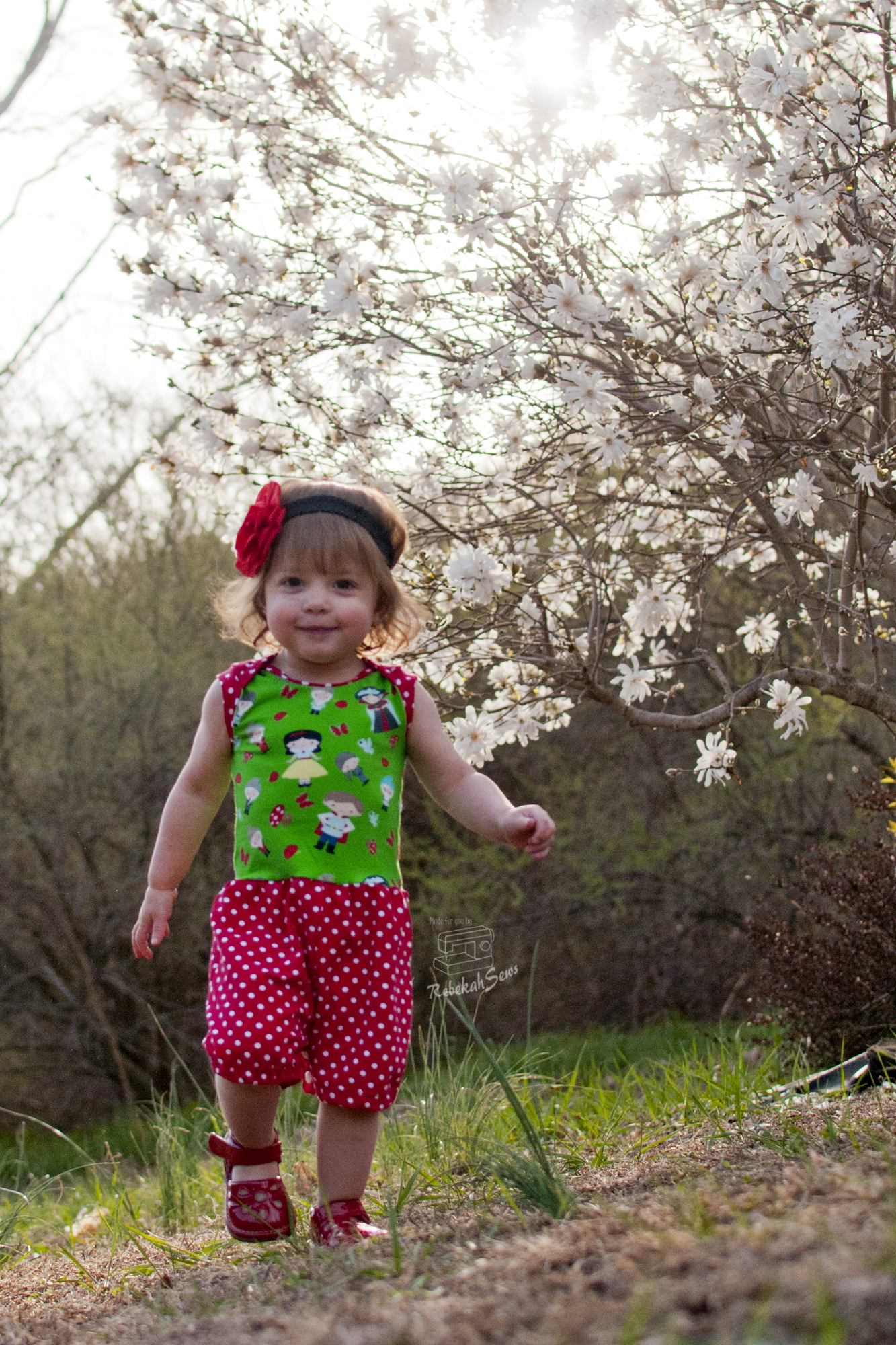 RTC_5868Now, to tell you about mine! When I tested this pattern I made a hip length peplum top with long sleeves and an onesie with skirt with short sleeves. I also had the pleasure of making this cute owl inspired dress in a size 4y for a special little girl. I decided to add the knit binding to the skirt for this one! Love! For the two for this tour I sewed for the spring! The first one is a double layered dress-Minnie inspired. To make the double layer I used the peplum pattern piece and the skirt pattern piece. RTC_8971Now, I did shorten the skirt as my girl is short to begin with and I lettuce-edged the hem. So this dress with the natural waist bodice length is a size 12mo, with the skirt being at the 3-6mo length. For the next garment I wanted something completely different! I wanted a romper!! So I scrolled through my other LKC patterns and decided to mash the BBB with the Romp n’ Play! RTC_8114I used the size 12mo bottom and that attached very nicely to the 12mo bodice with a little gathering. The only other change I made for this one is that I added an inch of length to the natural waist length bodice so that it was a tad longer. It is absolutely perfect!!!!