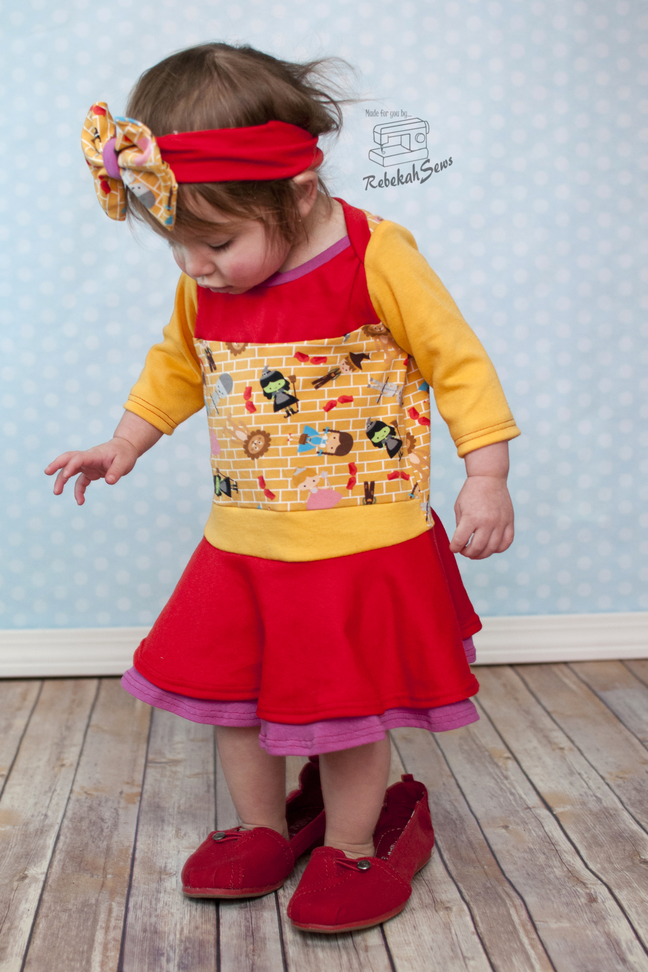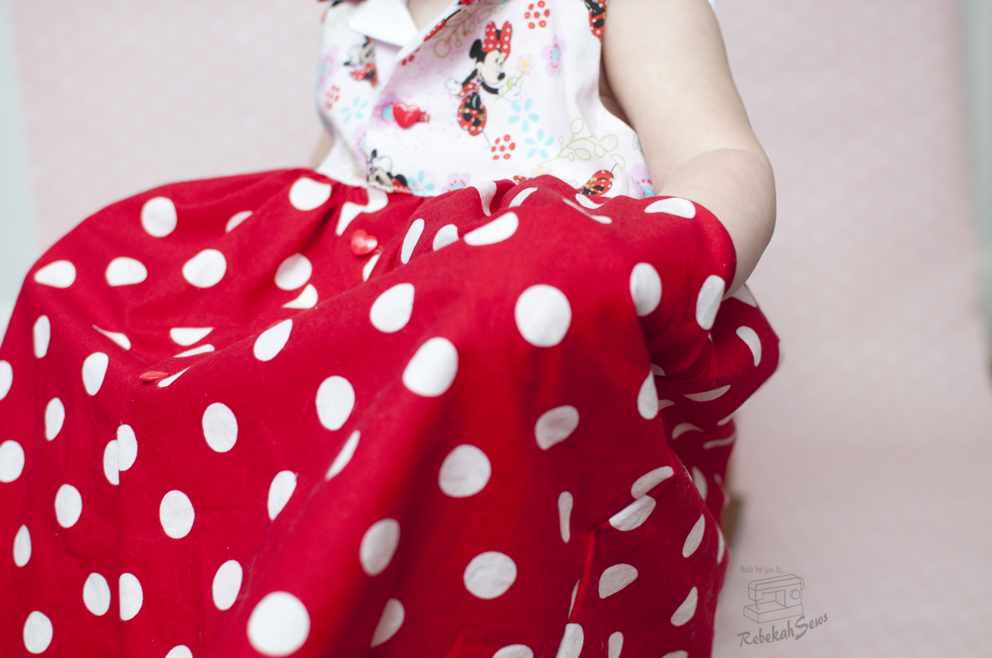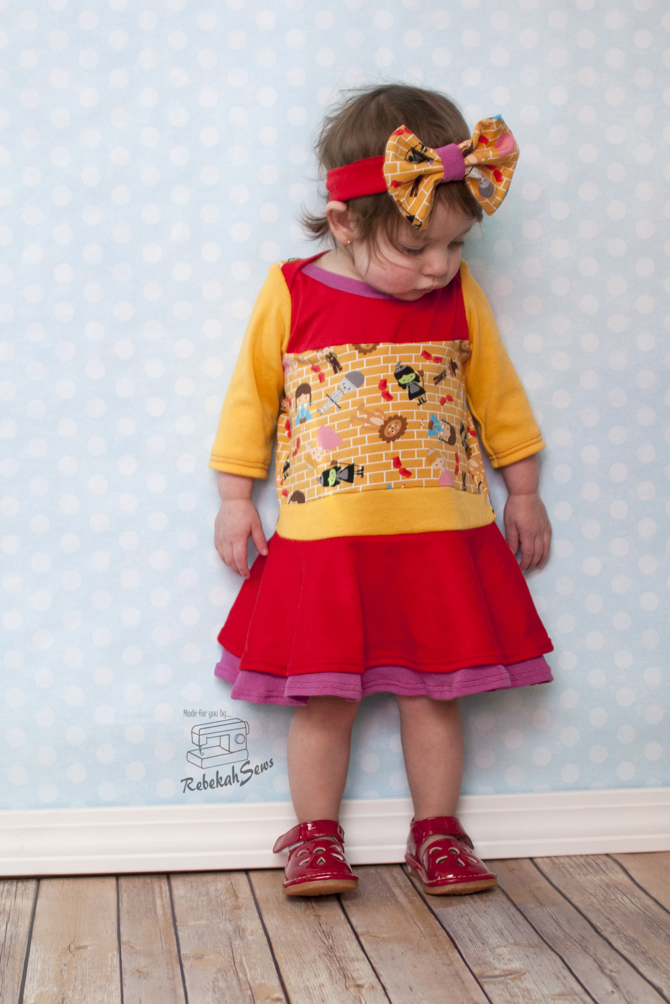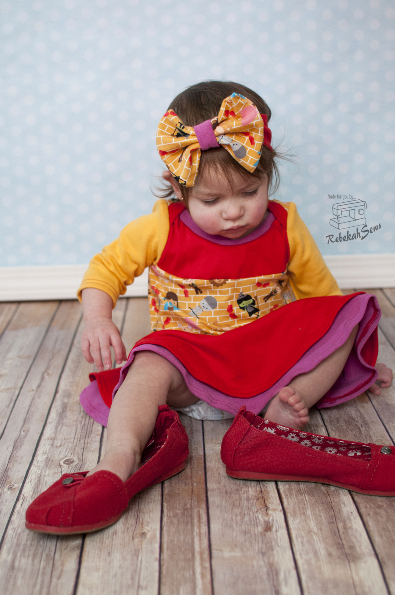 RTC_5868Now, to tell you about mine! When I tested this pattern I made a hip length peplum top with long sleeves and an onesie with skirt with short sleeves. I also had the pleasure of making this cute owl inspired dress in a size 4y for a special little girl. I decided to add the knit binding to the skirt for this one! Love! For the two for this tour I sewed for the spring! The first one is a double layered dress-Minnie inspired. To make the double layer I used the peplum pattern piece and the skirt pattern piece. RTC_8971Now, I did shorten the skirt as my girl is short to begin with and I lettuce-edged the hem. So this dress with the natural waist bodice length is a size 12mo, with the skirt being at the 3-6mo length. For the next garment I wanted something completely different! I wanted a romper!! So I scrolled through my other LKC patterns and decided to mash the BBB with the Romp n’ Play! RTC_8114I used the size 12mo bottom and that attached very nicely to the 12mo bodice with a little gathering. The only other change I made for this one is that I added an inch of length to the natural waist length bodice so that it was a tad longer. It is absolutely perfect!!!!