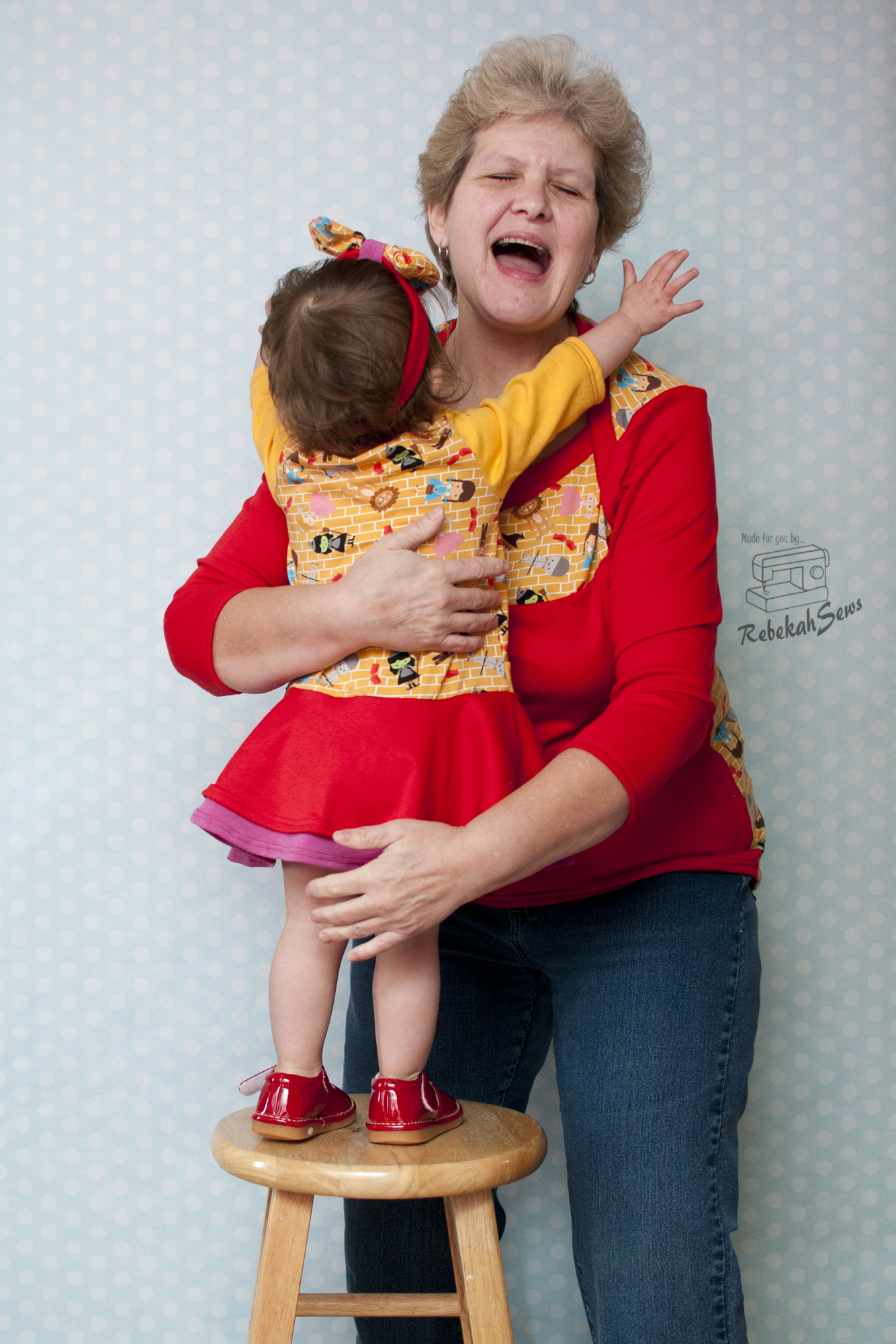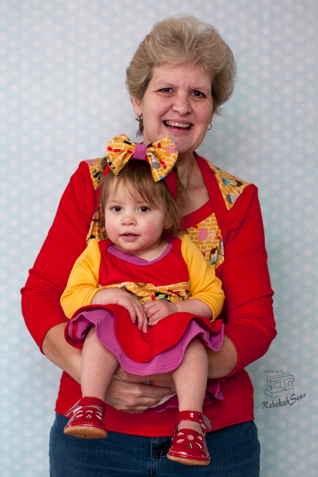 RTC_2544Ok, now back to the shirts. For mom I made a size large. RTC_2409I went with the traditional color blocking for this shirt. As you can see the fit is great and really shows her great curves. I think she loves it. What do you think? Now for baby girl I wanted to do a little something different. I wanted to make this a dress with a circle skirt. First, I shortened the shirt. I eyeballed it with the skirt pattern piece I had to make the right length. Unfortunately I cut off a bit too much in front. See that yellow band in front? Yup, I had to even it out. Turned out to be a happy accident, though, as I love more color blocking! For the skirt pattern I used Dandelions n’ Dungarees Saucy Skirt. The size 18mo fit perfectly on the 12-18mo top! I just love this as a dress!! The fit is spot on too!