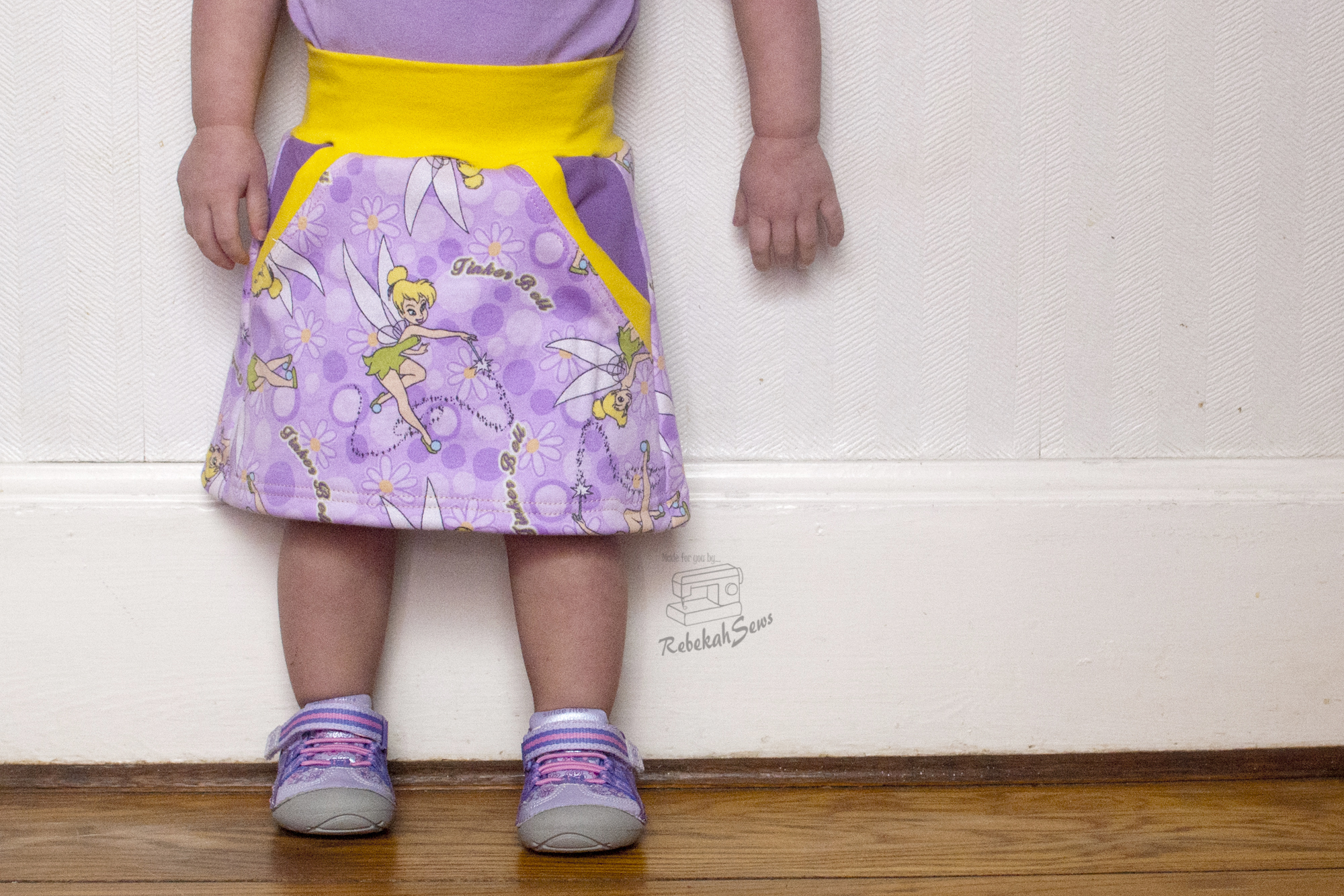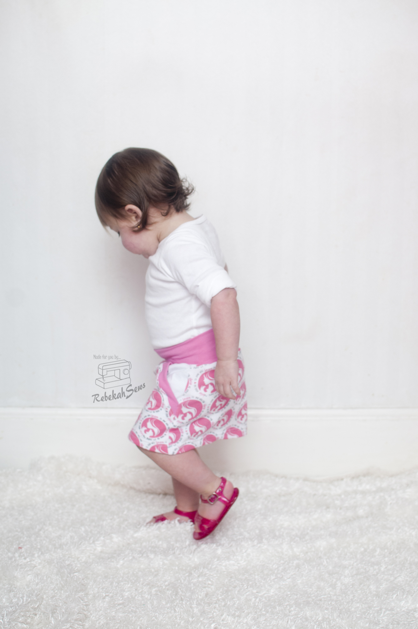 RTC_4725Now I knew I wanted to make more of these skirts so as soon as I got my new knits washed I made two more!! I made these ones bigger than what my girl wears as I want them to last awhile. She has so many clothes that fit now I am making more in bigger sizes so they are ready when she grows, which is happening every day! The Tinkerbelle skirt is a size 18-24mo and the pink skirt is a size 12-18mo. Now the pattern doesn’t come with size 12-18mo (it has 9-12mo and 18-24mo). So an easy way to create the 12-18mo is to just draw a line in-between the other two sizes! Easy peasy!