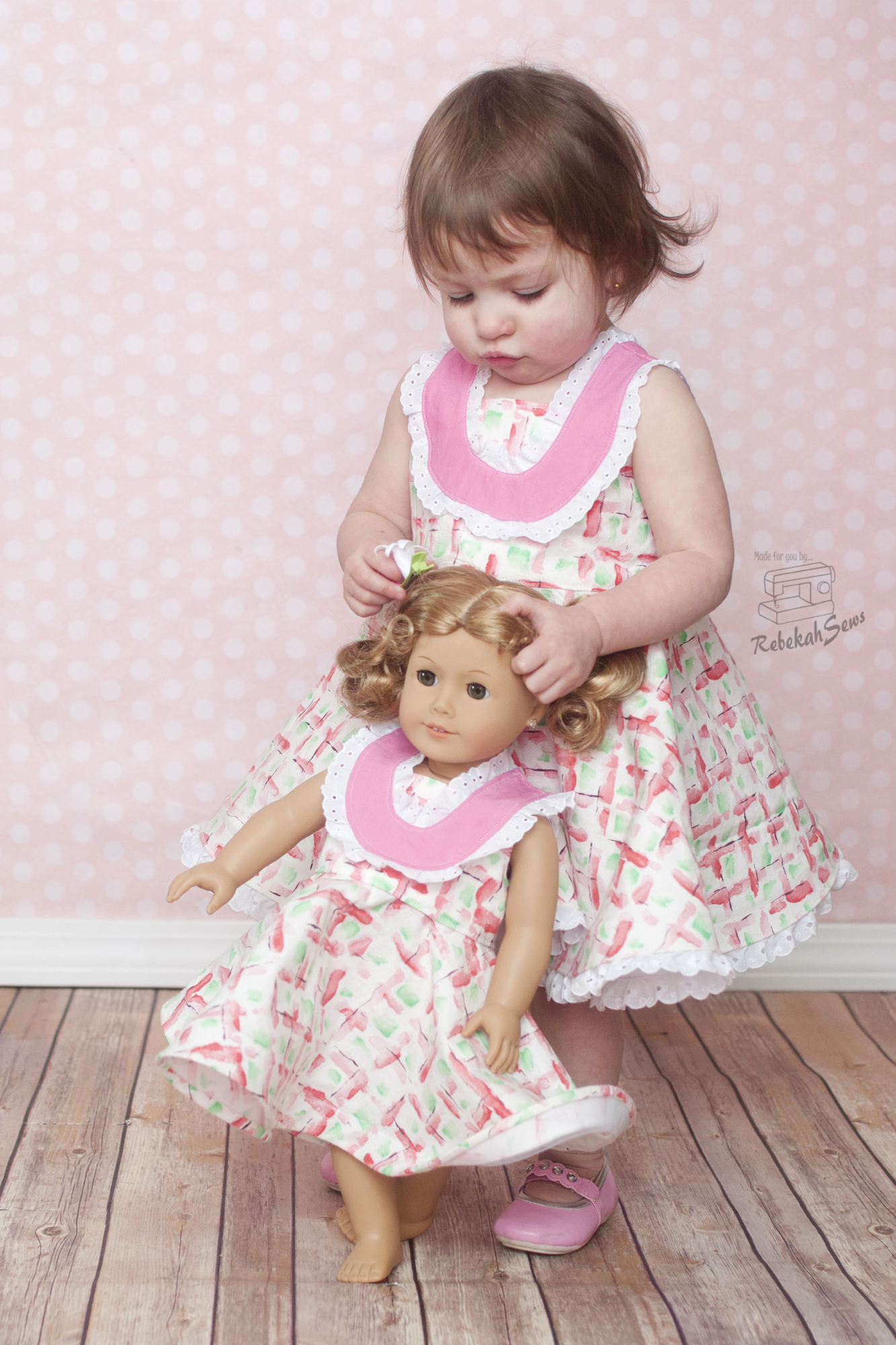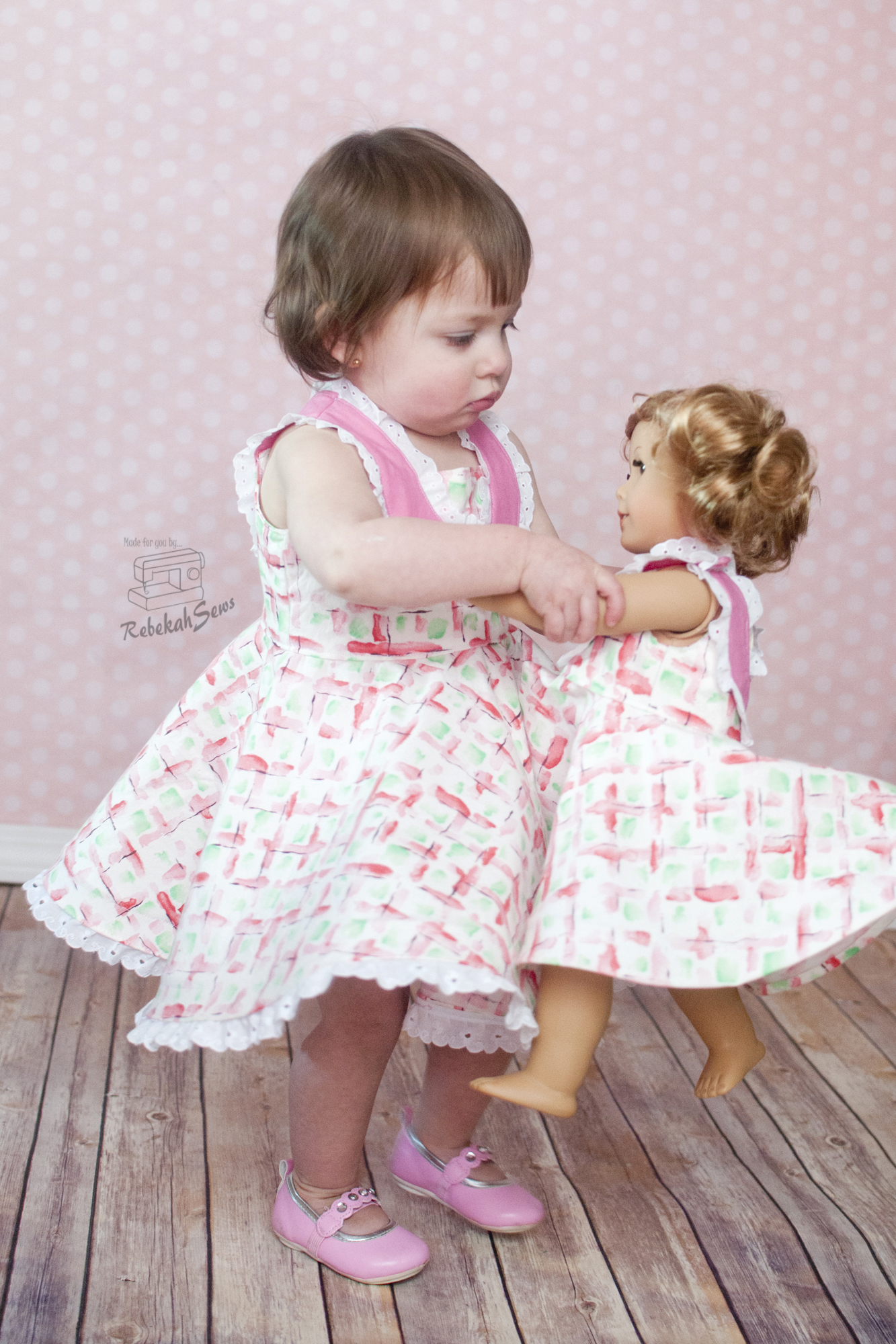 RTC_5410My girl is twirling around in a size 12mo dress. The fit is perfect on her! The doll dress also fits perfectly on her doll. For added ease of dressing her doll the straps are made differently than the girl’s dress. For the doll the straps are not sewn on the shoulder seam. Rather they are finished and Velcro is attached. I think it may work with snaps as well. I know I do want to try snaps instead of Velcro next time. To make the dress even a little more extra special, I added eyelet to the collar by sandwiching it in between before sewing. With just barely enough eyelet left over for the hem as well (alright, I’ll fess up. I technically didn’t have enough and had to add an extra 4″ of another eyelet to finish it!). I couldn’t be happier with the end result. It really came out as I was hoping it would!