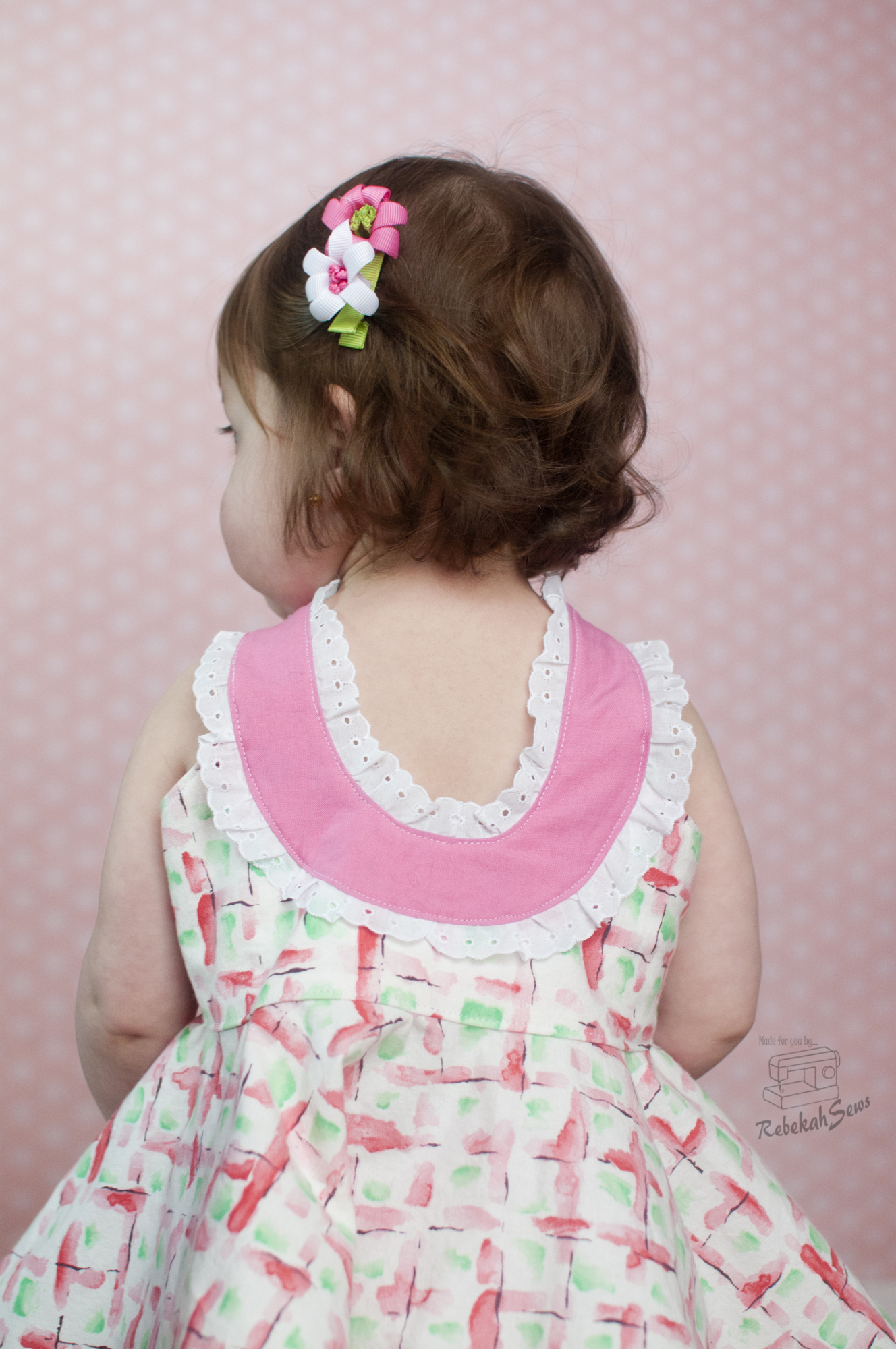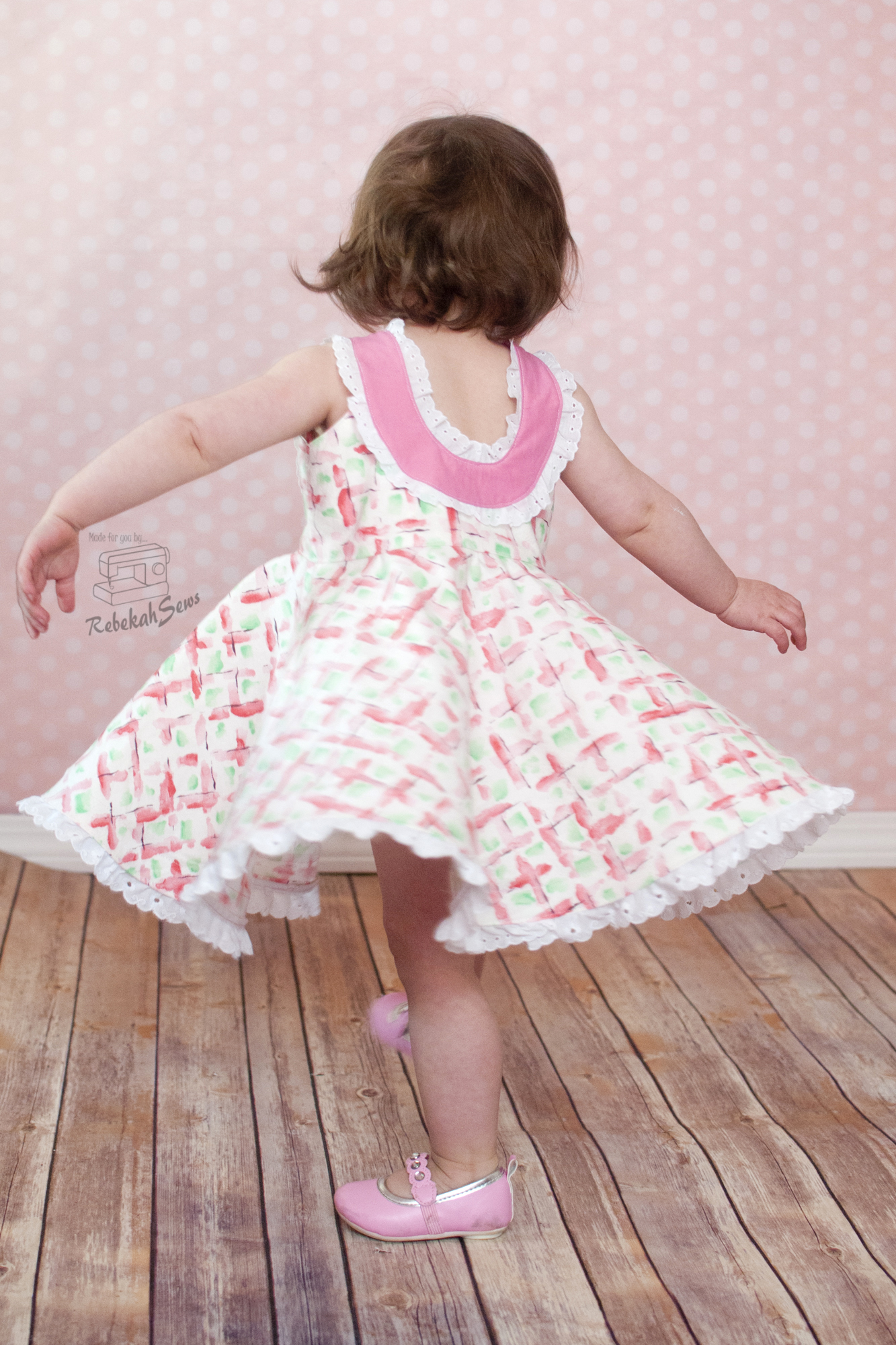 Take a look at the Bon Bon dress! RTC_5425When she first shared this design with me I instantly fell in love and couldn’t wait to sew this up. I knew this would be baby girl’s Easter dress right away! This dress features a scoop like neckline that encircles all the way around to accent the front and the open scoop back. The skirt is a circle skirt with all the twirl power a girl could want! Do you see Ruth is learning to twirl?!RTC_5275-1 Seriously cute, and I’m not just saying that because I’m her mother. That is part of it, don’t get me wrong, but seriously it’s so so cute! I digress again; let’s go back to the dress now. There are no closures to worry about as the bodice has enough room to slip this beauty on. RTC_5276Whether you are looking for a sun dress or special occasions dress this is perfect for any girl coming in sizes 12mo-14. Don’t forget that this also includes an 18″ doll size for your little ladies special friend! Want to add a little something to define the waist? You can make a belt to accent it as that is also included in the tutorial. With all Mandy K’s patterns the tutorial is well put together to walk you through each step without any issues making this perfect for the advanced beginner and those of more advanced sewing years!