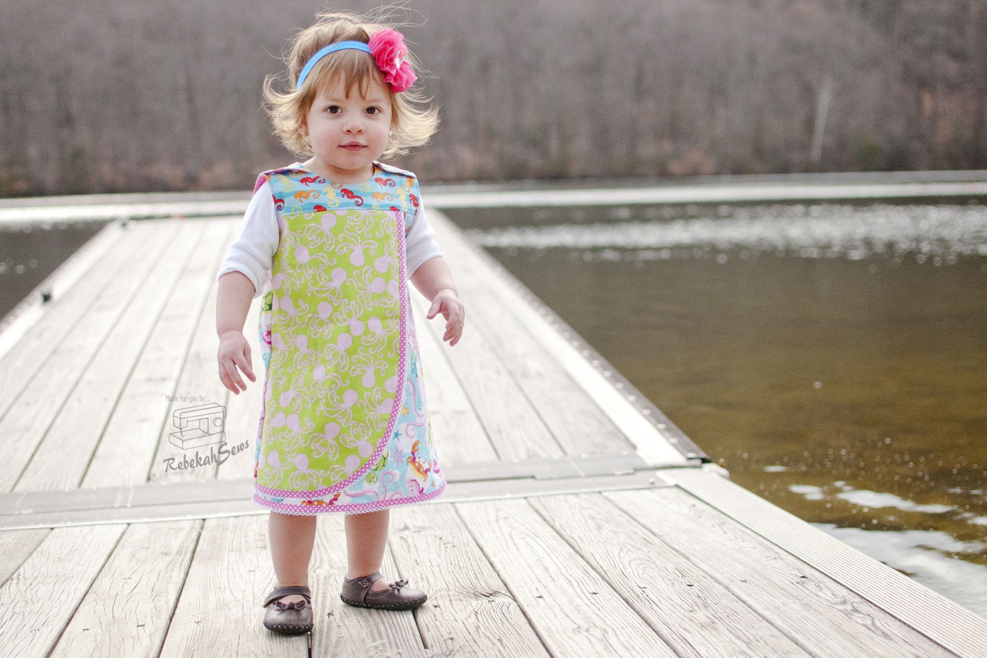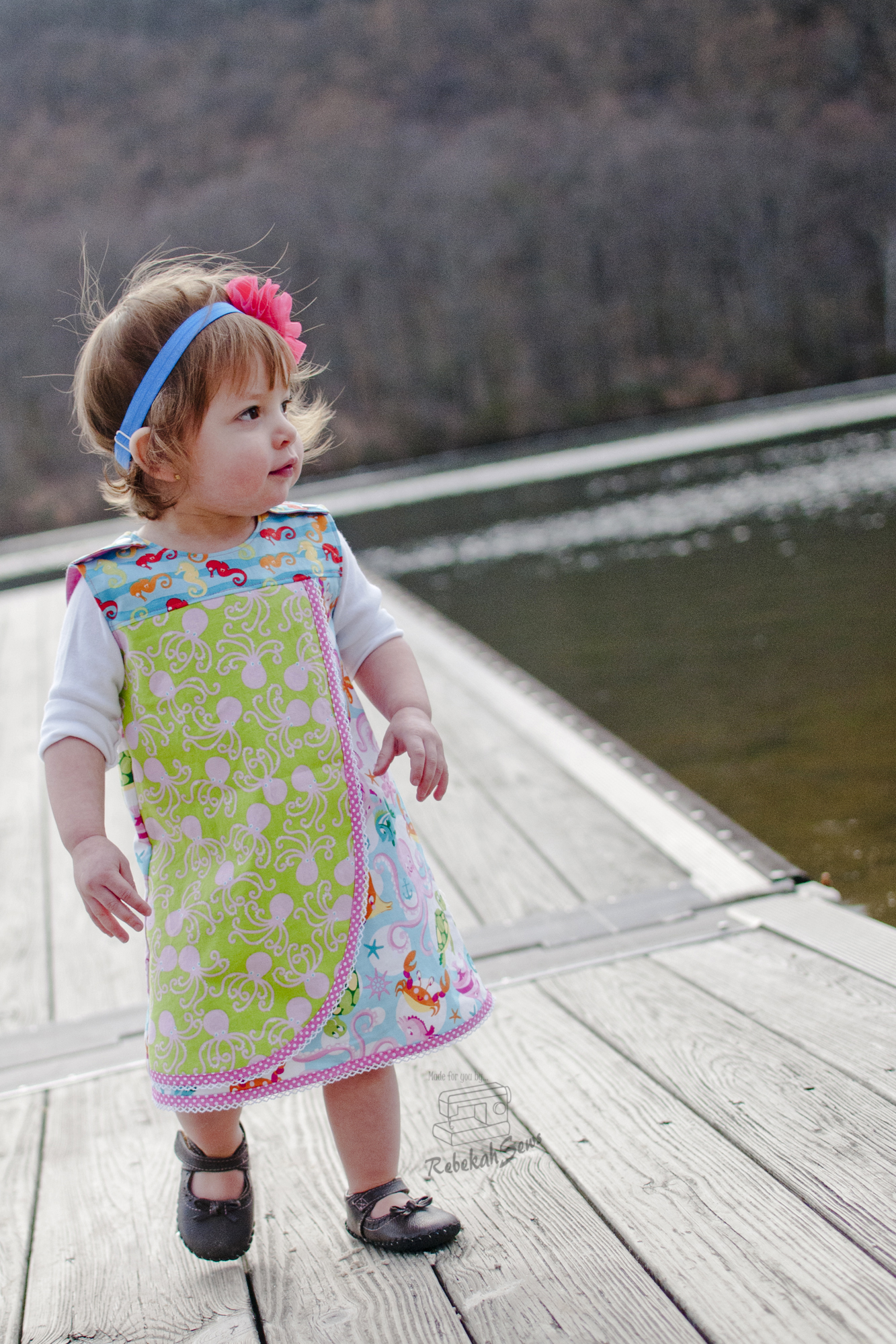 RTC_7657First, let me start off by saying that this A-line jumper is just perfect for every season! As you can see it isn’t warm enough yet for sleeveless dresses, so layering is a must. There is plenty of room for layering with this jumper! OK, now that I have gotten that out, let me continue with a little more about the pattern. The Estherlyn jumper comes in sizes 3m-10yrs and features a curved apron front and button shoulder closures. The apron front is fully lined so no showing the wrong side of the fabric should the wind pick up!RTC_7577 Speaking of lining, you can create this fully lined or half lined- your choice! The detailed tutorial for this pattern is wonderfully done. It walks you through each step and even includes tips making this easy for a beginner to complete! There is even a section on where and when to add trim if you’d like!