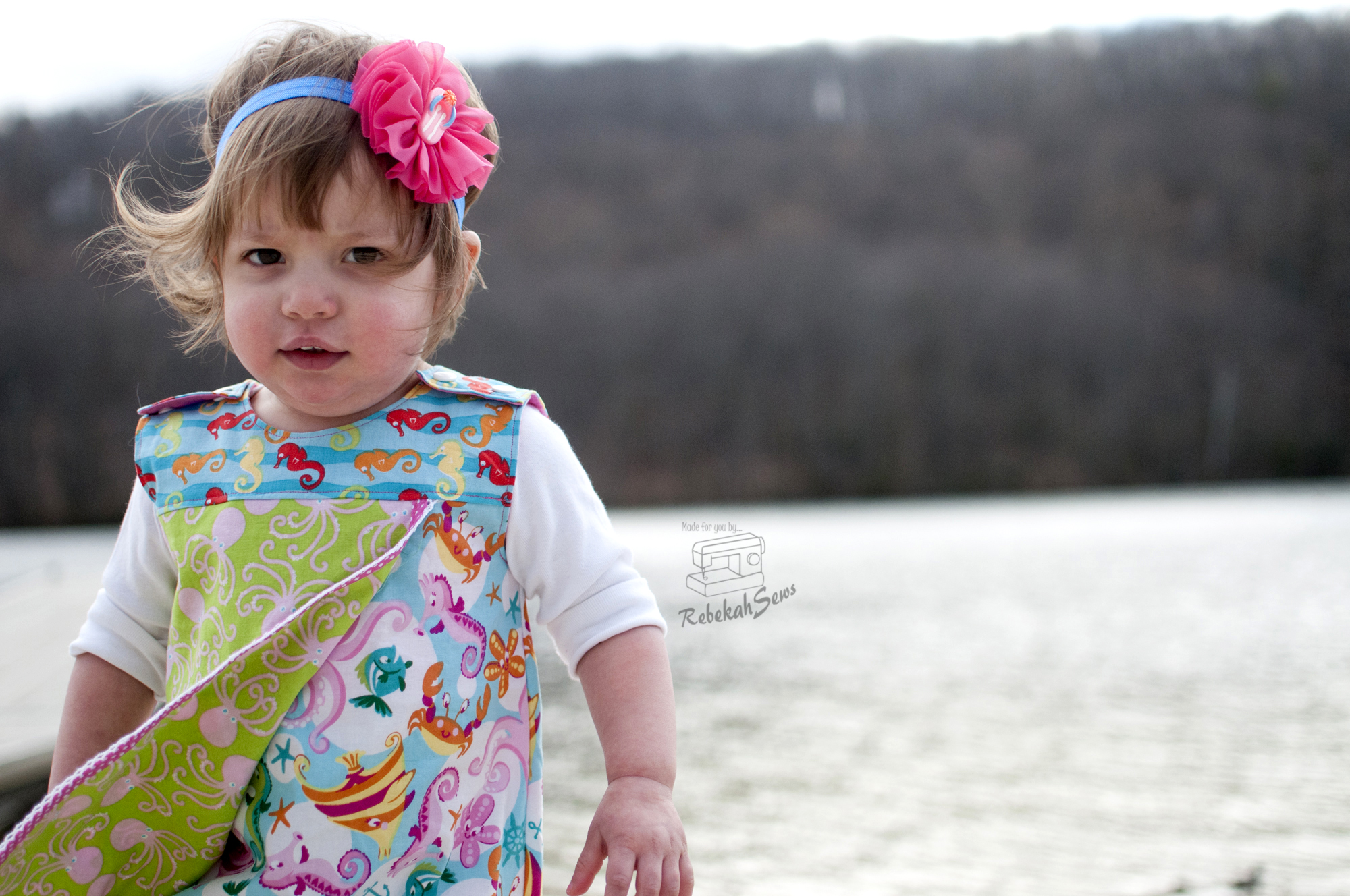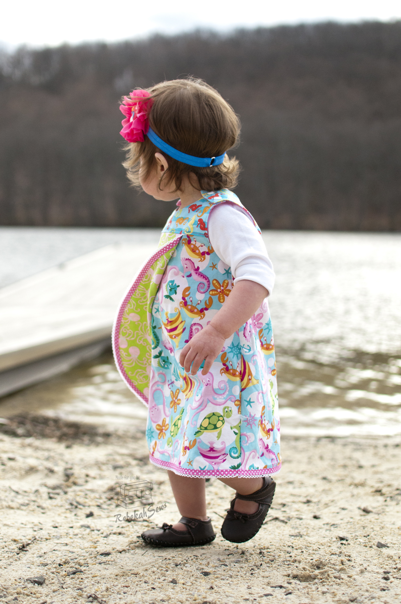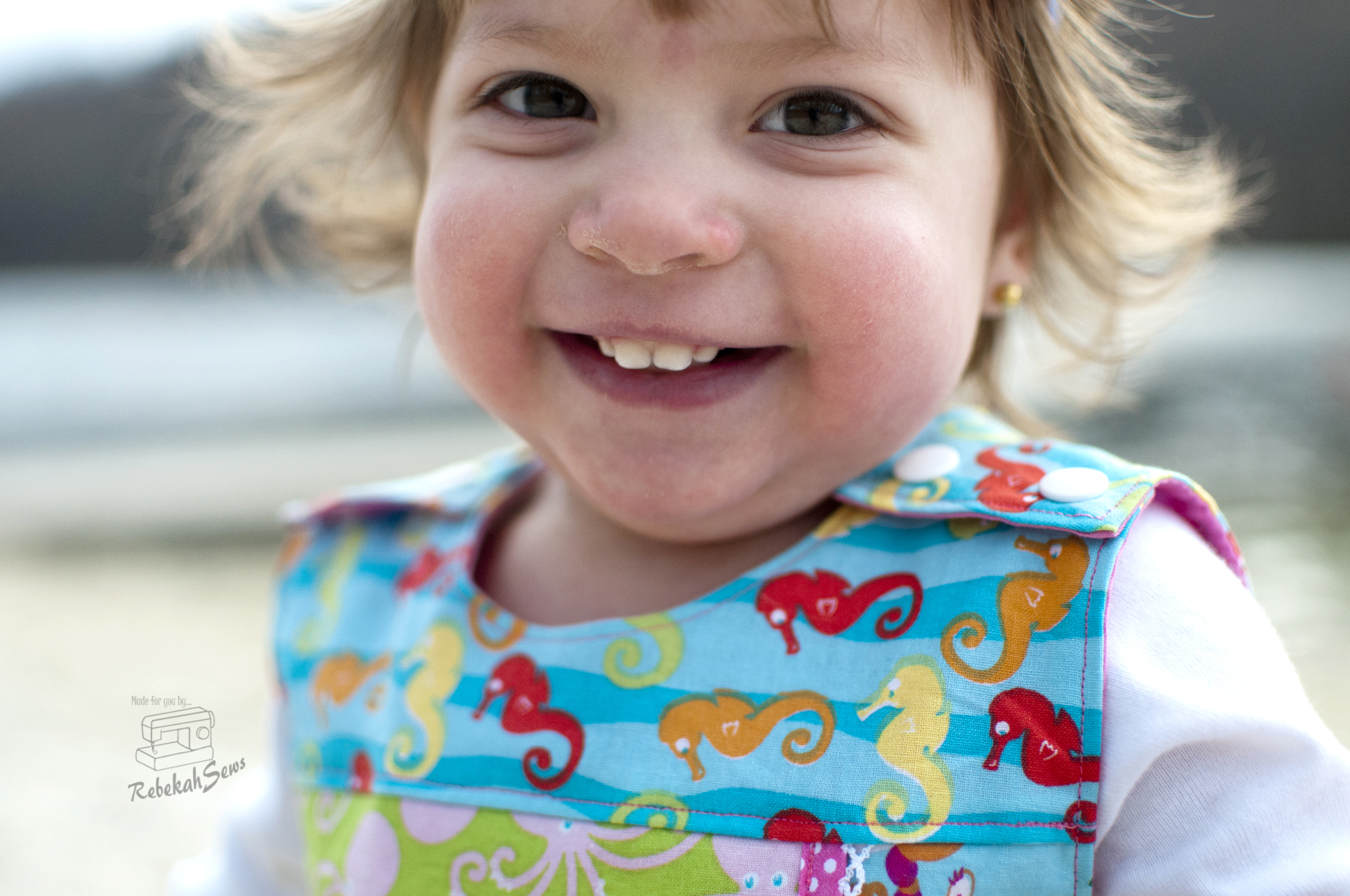 Now let’s take a look at my jumper, shall we? RTC_7630My baby girl is in a size 12mo here, which fits her perfectly! I just love every aspect of this jumper, and it is super quick to make! This took about 1.5hrs if I remember correctly. For my dress I finished the edges of the apron and hem with bias tape from Fascinating Finery instead of doing a traditional hem. The length of the dress is 3/8″ longer as I did forget to cut that off! Oops! In my version I opted for the partial lining. Now instead of doing a traditional hem on the lining, I just surged it as it is on the inside. RTC_7540Yes, I cheated a bit. Last but not least, I closed my jumper with snaps as I couldn’t decide on the perfect buttons! Snaps work for us, though, and make closing the closer a snap!! Sorry, couldn’t resist.