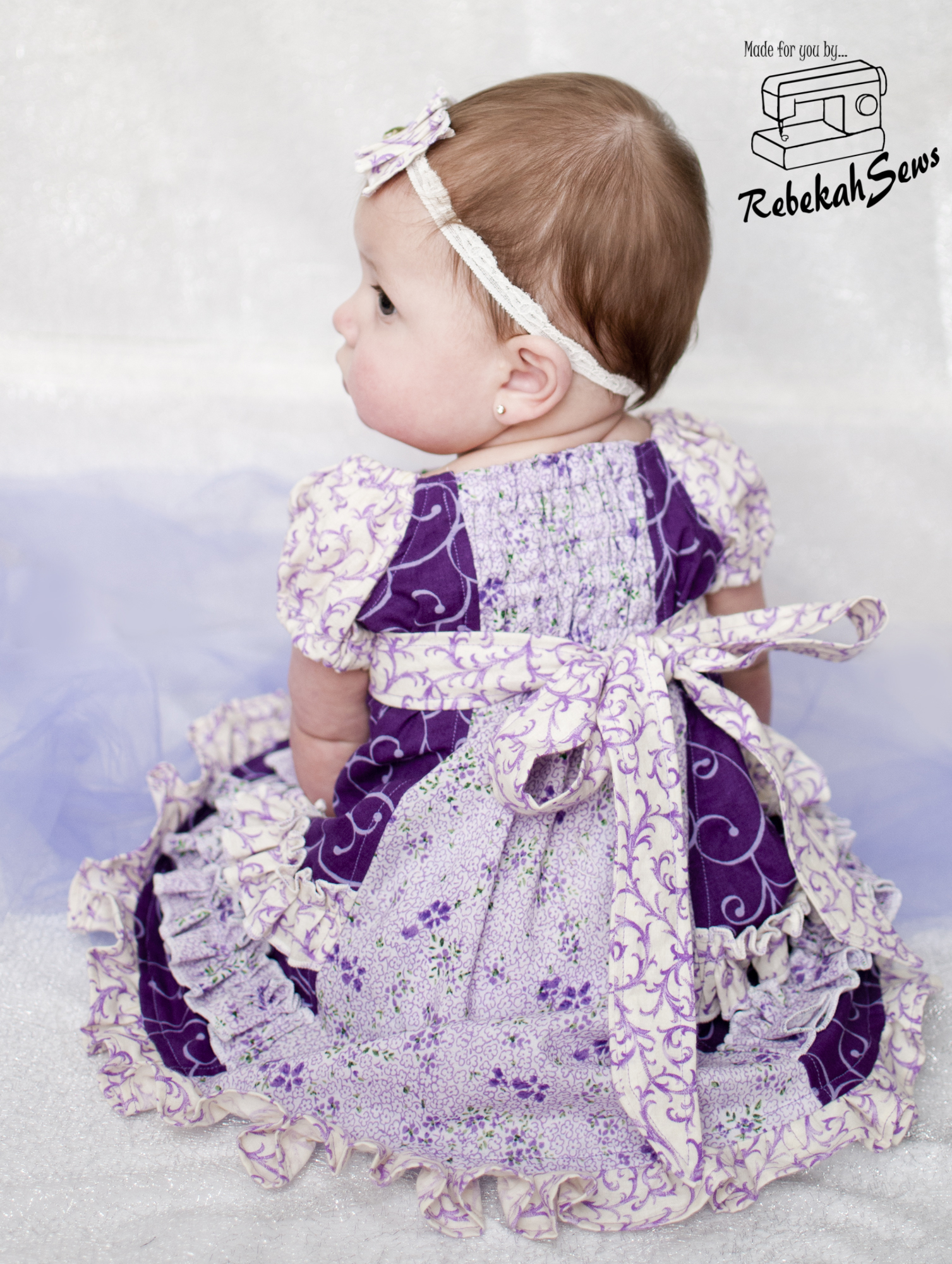 and can be lengthen or shortened with the ribbon which ties through a loop on the back (or front as it can be reversible). Then make a delicate bow and you have the sweetest dress around! I may be a little biased but it is extremely sweet on my sweet little baby doll!
