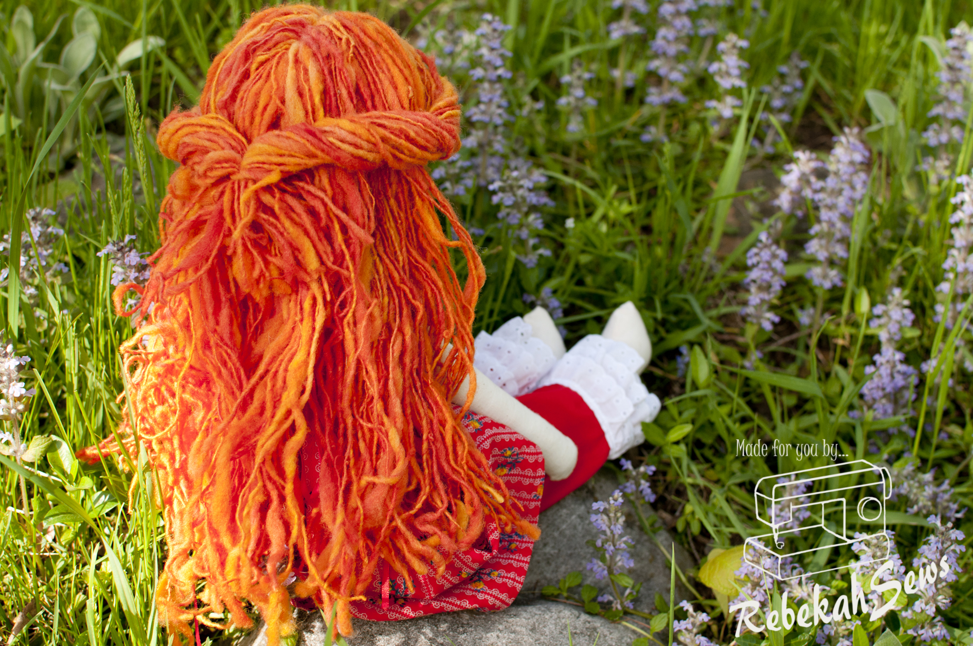 Now to tell you about Constance! Isn’t she just beautiful?? For her body I used a heavier woven. RTC_3058The only problem with the fabric I chose was that it frayed easily. Next time I would definitely pick something that doesn’t do that. I chose to only make the pinafore (that closes in the back with ribbon) and the bloomers. On all the pattern pieces there are lines that show you where you can add eyelet to really beautify this ensemble.RTC_3051 I chose to only add it to the bloomers though. I also chose to not create a face for her. There is a template for a face, so if drawing isn’t your thing you don’t have to worry about lopsided eyes. I like the simplicity of a blank face though. It lets the imagination run wild! RTC_3025For her hair I used handspun wool I have been hoarding for years. At one point I was going to learn to crochet. Well, let’s just say I don’t have the patience for crocheting. I ended up giving my yarn stash to a friend that actually does crochet. It was pure luck that this yarn didn’t end up in that box too! It is perfect for her hair! I wish I had lovely locks like that….