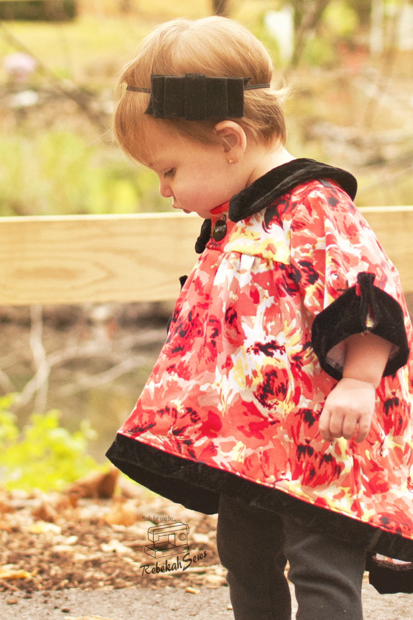 This lovely cardigan is available in baby sizes (NB-24mo), child sizes (2-7), and tween sizes (8-16). It uses knit fabric to create a fun look with a little ruffle bustle area on the back. There are instructions included on how to make a bow to embellish the back with if you’d like as well. It closes with a button and button loop. No need for a button hole!! While I made mine for everyday wear, there were others who made it out of dressy fabric like lace for a dressy look. This pattern is really fun and versatile!