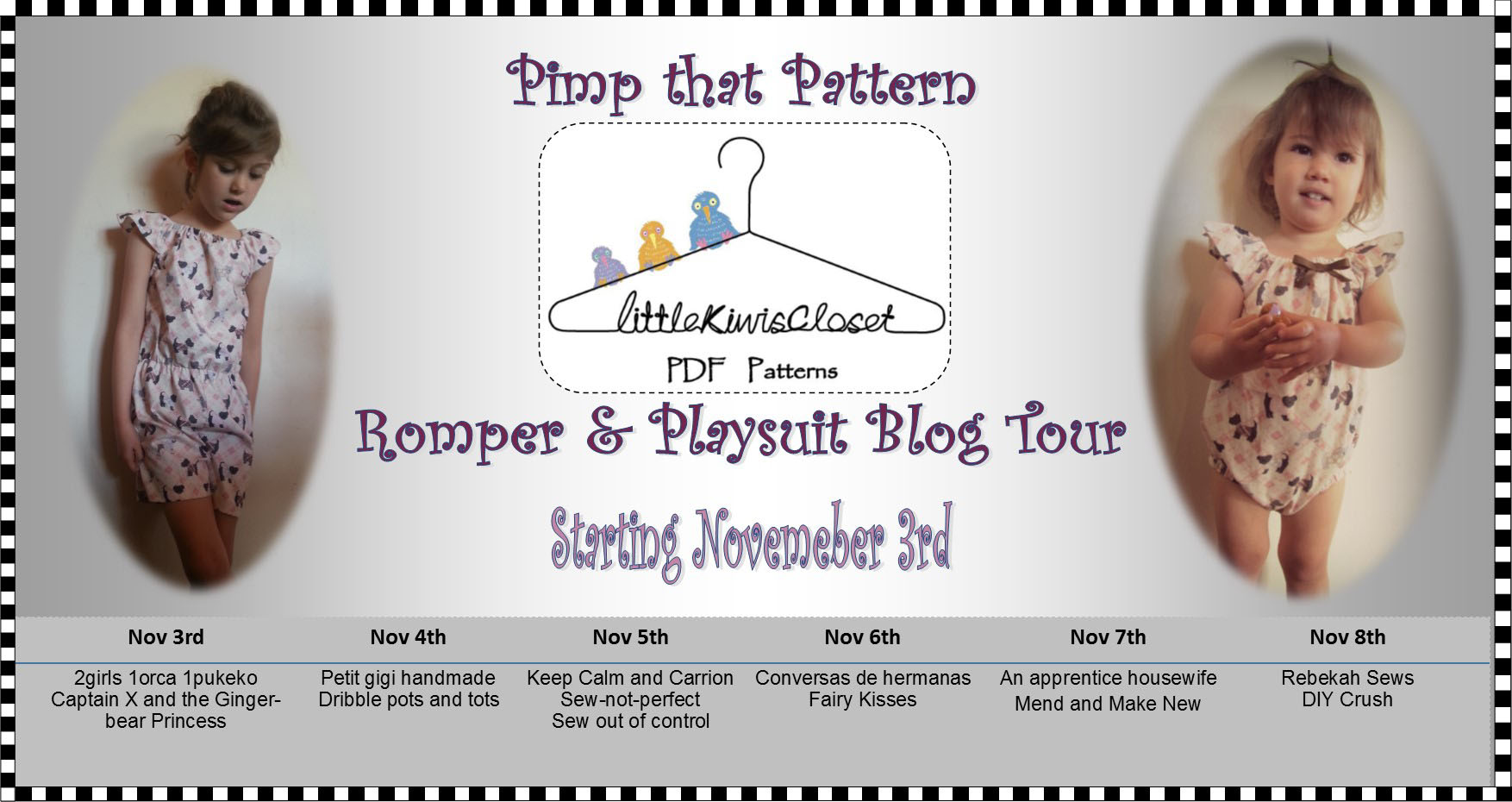 Who else likes taking an already awesome pattern and using it to create something that is uniquely yours with little modifications? I know when I first started sewing, modifying a pattern or adding something to it that wasn’t part of the pattern was rather scary. Once you get more confident in your own sewing skills the possibilities become endless. That being said, when I had the chance to be part of the Pimp That Pattern Tour of Little Kiwi’s Closet Romper and Playsuit patterns I gladly jumped at the opportunity.