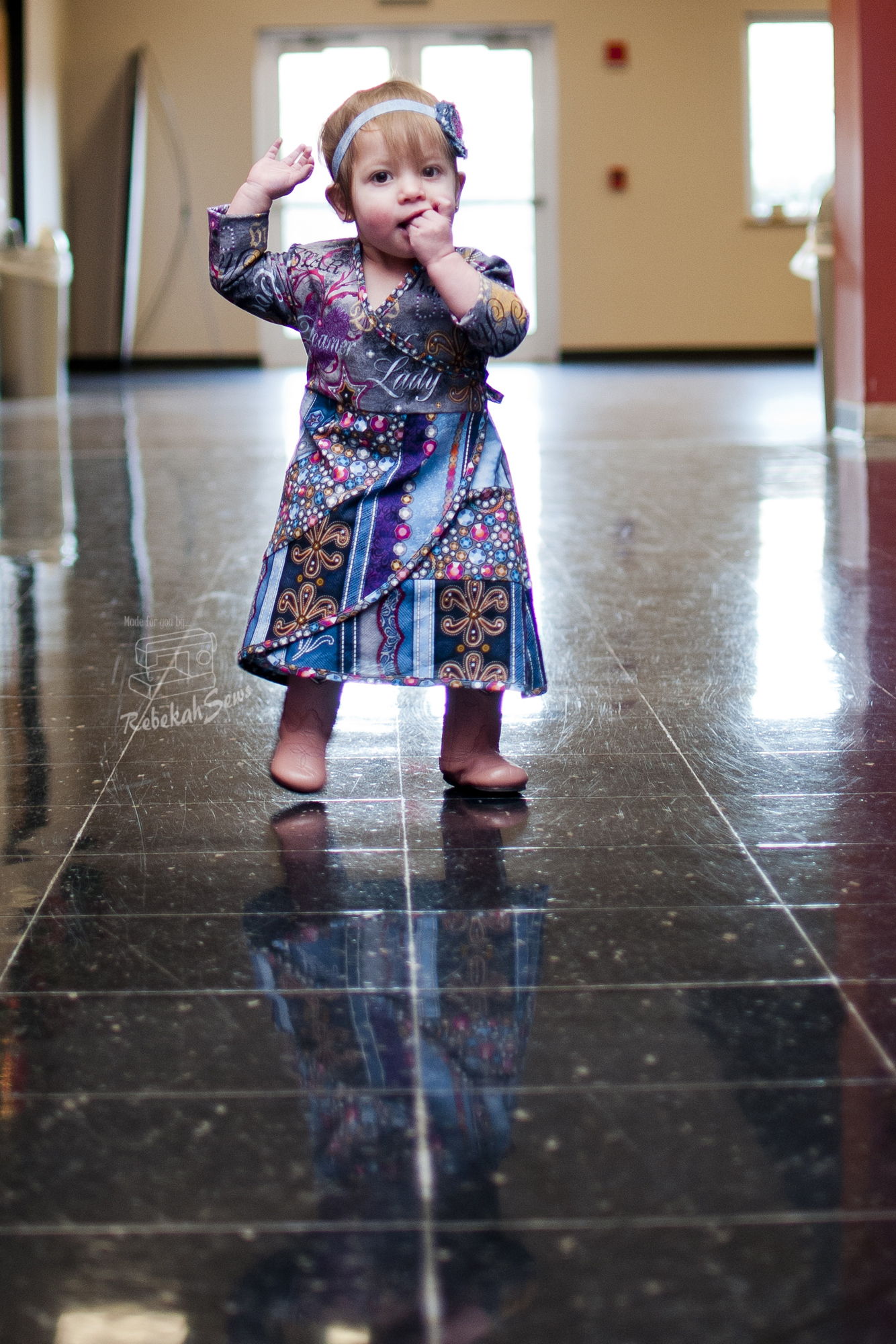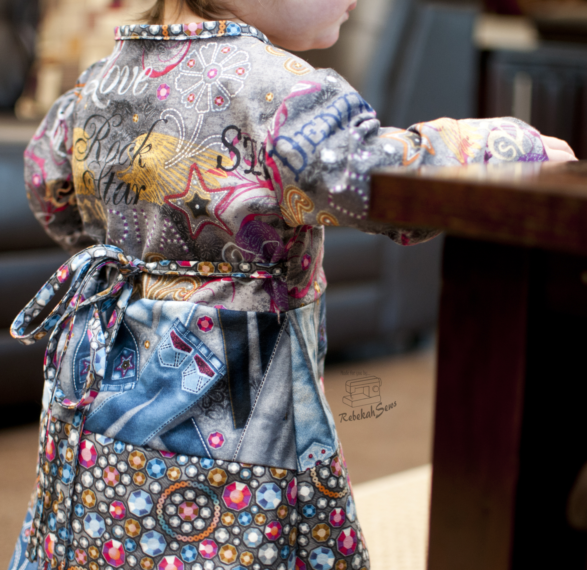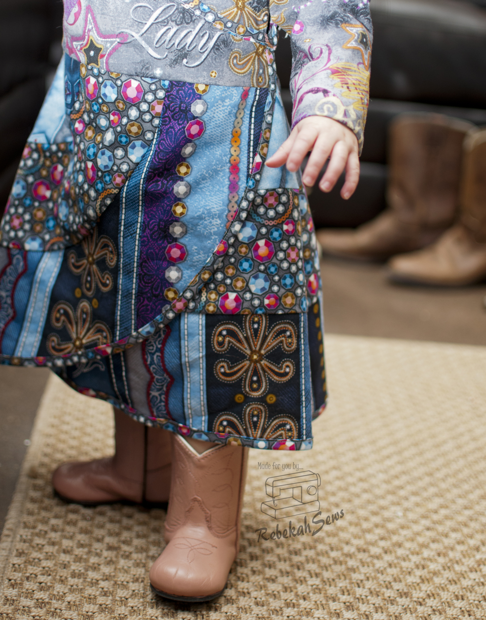 I did the woven version in a size 12mo for my girl. Now my peanut is at the lower end of a size 12mo. RTC_9503Her chest is 18.5 inches and she is 29 1/4″ tall. Yup, definitely a peanut! Even though this is a tad big on her I love the fit. This dress being a real wrap dress also gives it a little more ability to be adjustable so it will fit her now and later! The tutorial features illustrations and photos which give it clarity. However if you get stuck, just head on over to the Facebook group for help! It is a fast sew once it’s cut out. Yes, there are quite a few pages to print and cut- 39 pages for the woven version and 50 pages for the knit version. Those are needed though for that unique skirt. To make printing and taping a bit easier though, this pattern offers a layer feature so you only have to print the size you need! How is that for convenience? I think a confident-advanced beginner could sew this pattern up with amazing results!
