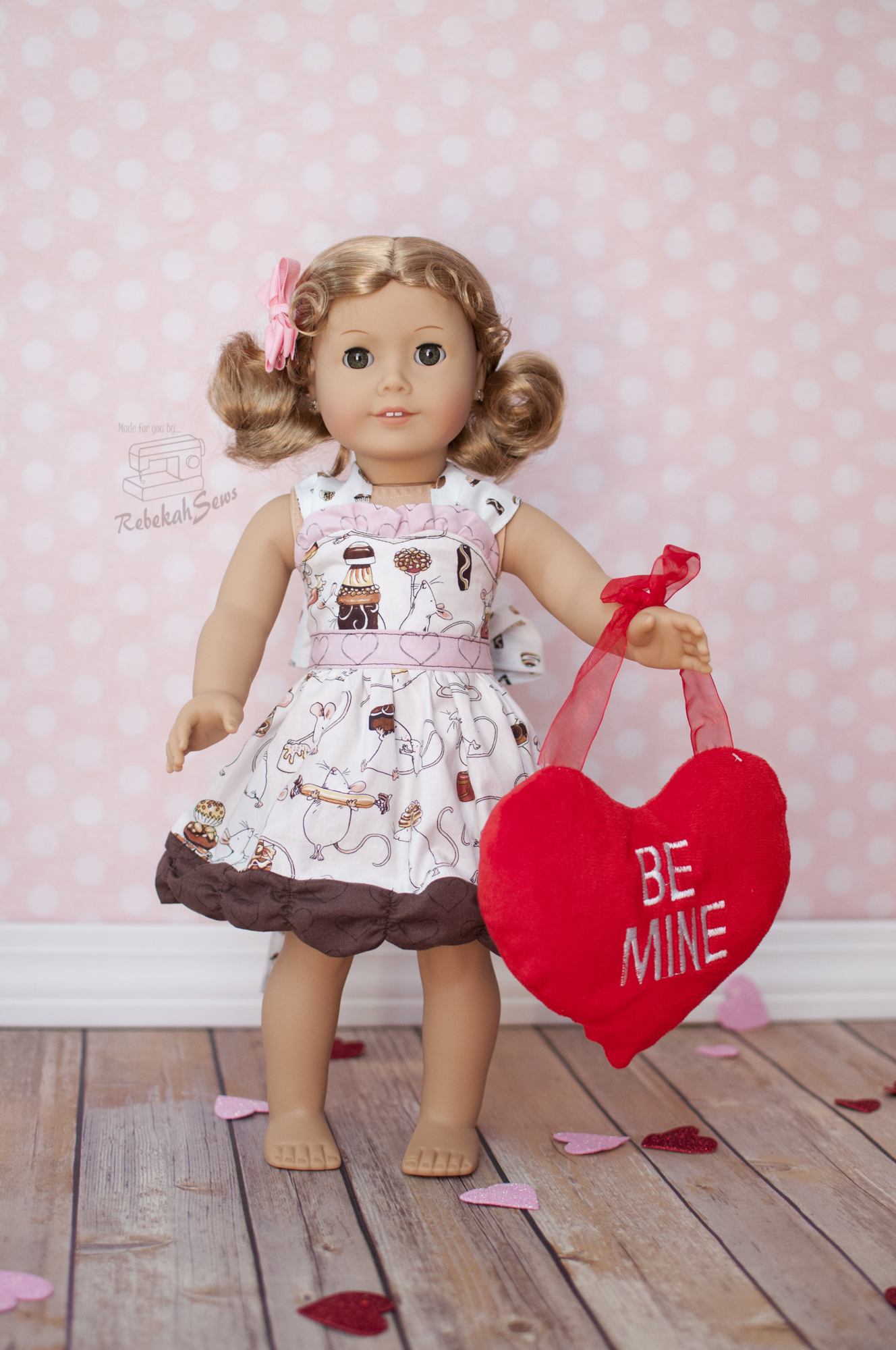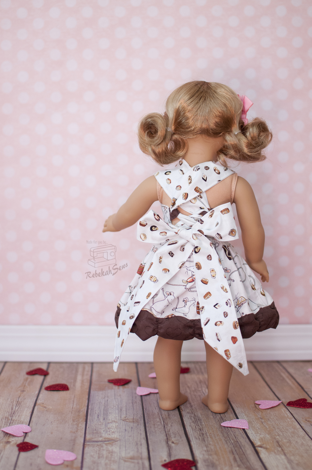 RTC_0080For my girl’s Valentine dress I decided to have a bit of fun. I wanted to steer away from the more traditional looks of Valentine’s Day (hearts, roses, etc.) and feature a more uncommon theme. Can you guess it?? Chocolate!!!! When I found this fabric line called Chocoholics I knew it was perfect for my chocoholic girl. She can thank her Grammy for that. Grammy was the first one to introduce her to chocolate and she can’t get enough ever since. Bad Grammy!! LOL. I digress; back to the dresses now. RTC_9999For my girl I made her a size 12m and the fit is AMAZING!!! The corset back certainly helps for fit too as you can tighten or loosen as much or little as you want. As you can see I chose the overlay ruffle for her. I also made my very first doll dress! The same Chocolate Grammy gave my girl an American Girl doll for Christmas (good Grammy!) and it is time I started sewing for her too. Again the fit is great on the doll too! Did you notice the ruched ruffle? I love it. I would love to try it using the shirring method next time instead of 1/4″ elastic as I think that will help it curl a little less so you can see more of it, just because I love it so!